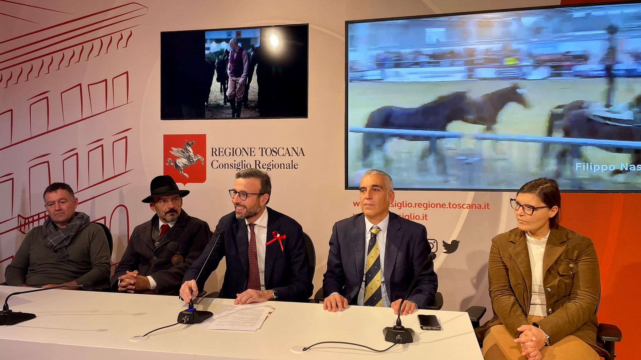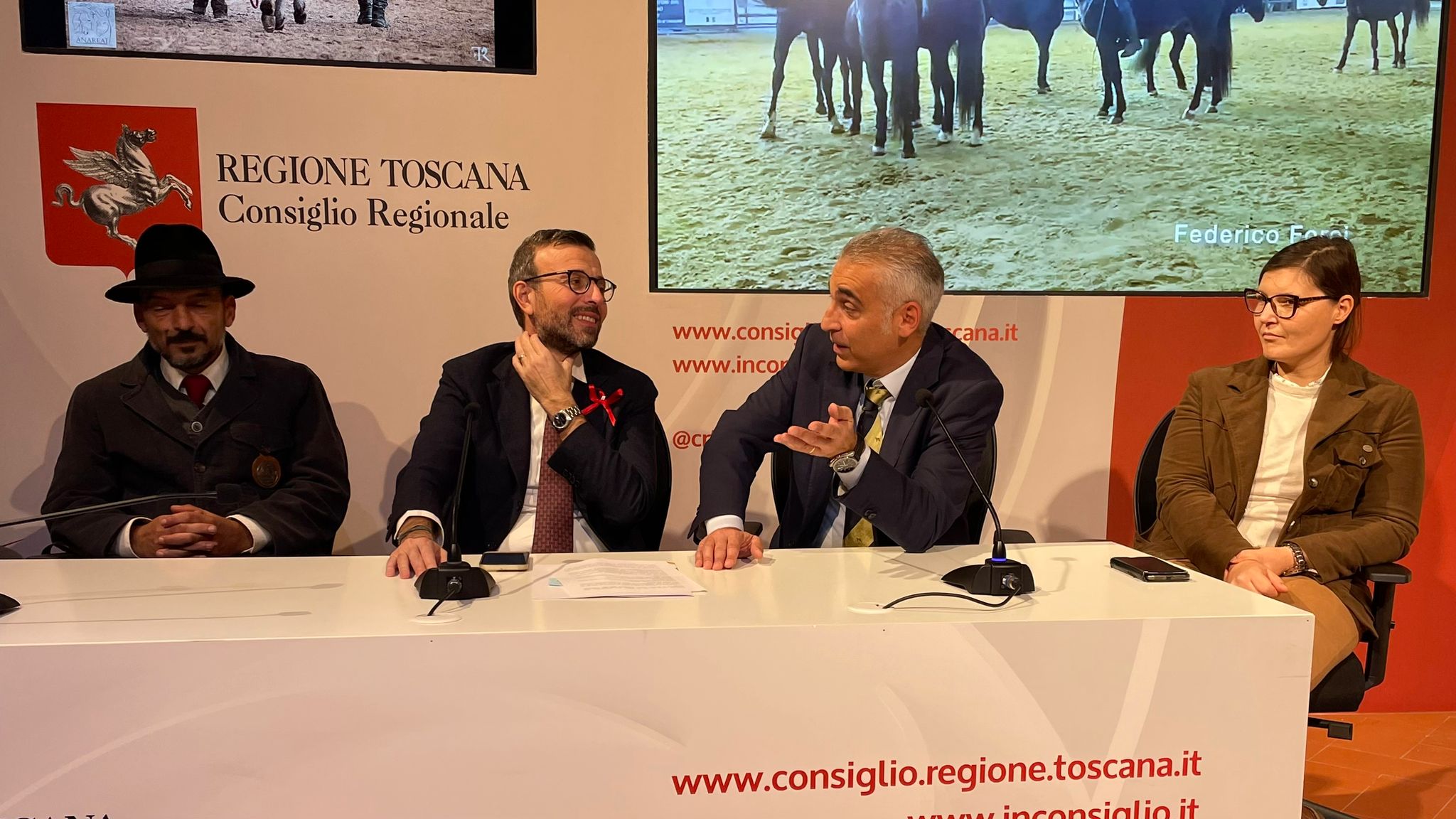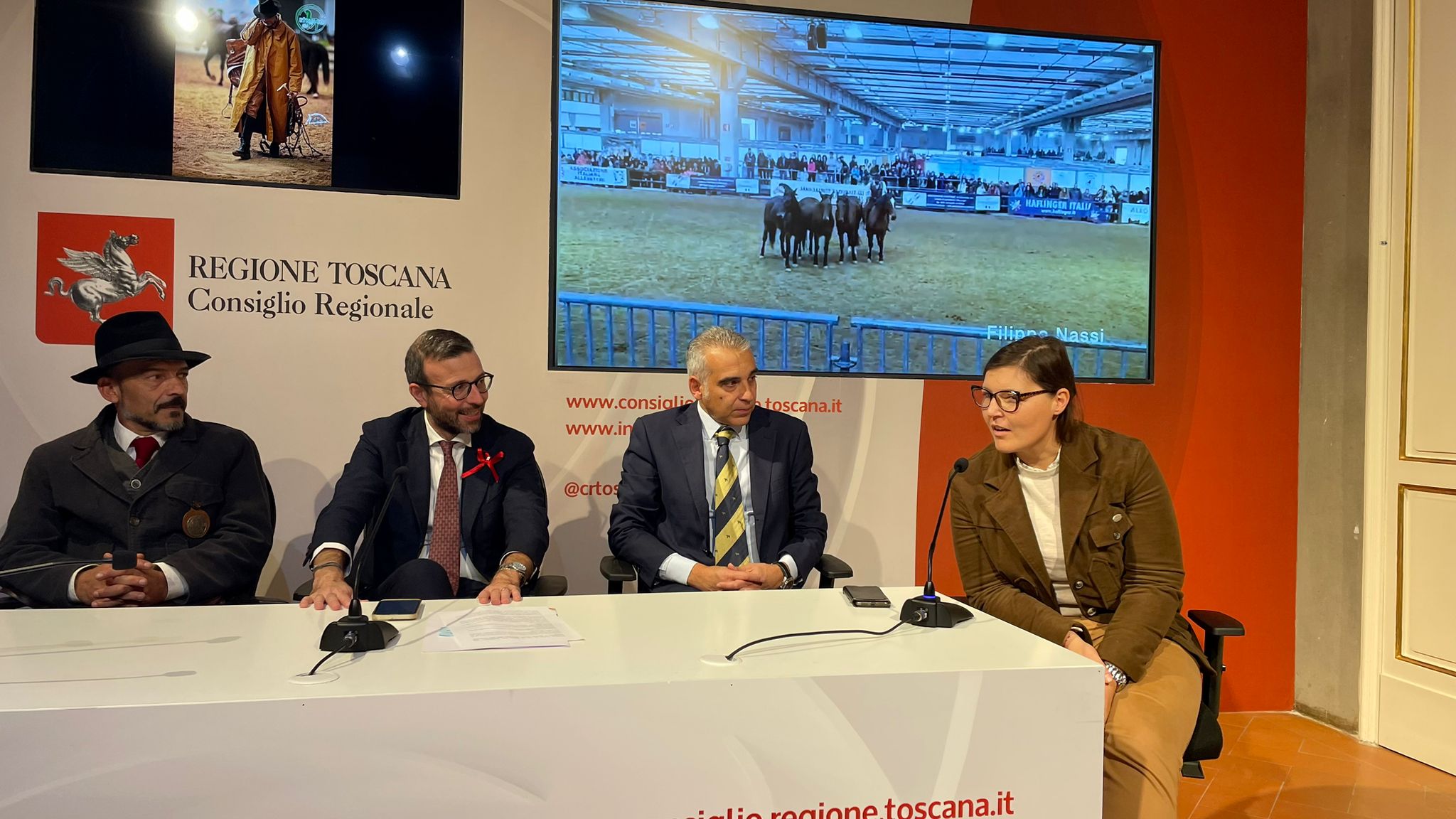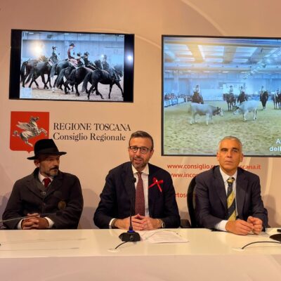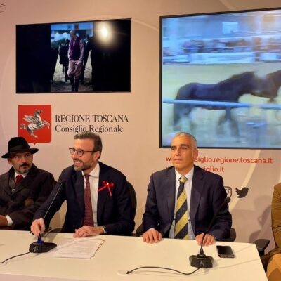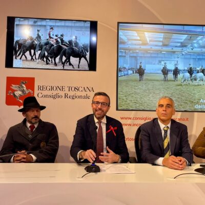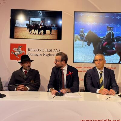 Firenze – Il buon esito della partecipazione delle associazioni toscane all’ultima Fieracavalli di Verona porta il segno anche del Consiglio regionale della Toscana. “Abbiamo deciso, insieme al consigliere Petrucci e a tutto l’Ufficio di presidenza, di sostenere chi racconta ogni giorno con il proprio lavoro quanta storia, quanta tradizione ci sia in questo settore in Toscana. Il nostro impegno è di continuare a farlo in futuro, perché noi intendiamo sostenere chi testimonia la bellezza della nostra regione”. Il presidente del Consiglio regionale, Antonio Mazzeo, ha salutato così le associazioni di allevatori toscani, riuniti a palazzo del Pegaso per celebrare la partecipazione all’edizione 2023 della Fieracavalli Verona. L’Associazione nazionale allevatori cavallo di razza (Anam); le associazioni ‘Butteri Alta Maremma’, ‘Cuor di Maremma’ e ‘Cavallino di Monterufoli e Asino Amiatino Ets’ lavorano in Toscana e portano avanti razze tipiche italiane/toscane (maremmani, monterufolini) e hanno partecipato all’evento dell’annuale che si tiene a Verona. La conferenza stampa si è tenuta questa mattina, mercoledì 22 novembre, a palazzo del Pegaso.