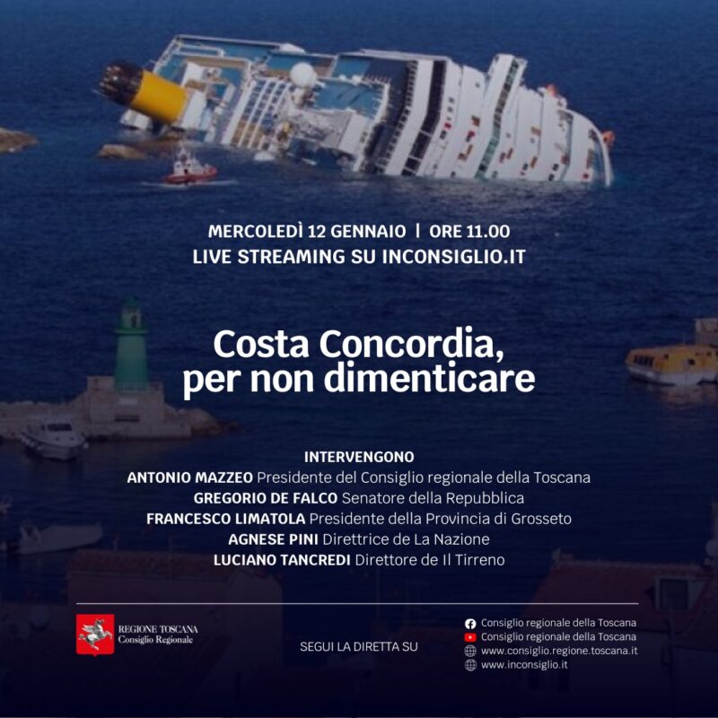 Domani, mercoledì 12 gennaio, il Consiglio regionale ricorda il disastro avvenuto all’isola del Giglio con una diretta streaming. Intervengono il presidente Antonio Mazzeo, il senatore Gregorio de Falco, il presidente della Provincia di Grosseto Francesco Limatola, la direttrice de ‘La Nazione’, Agnese Pini, e il direttore de ‘Il Tirreno’, Luciano Tancredi
