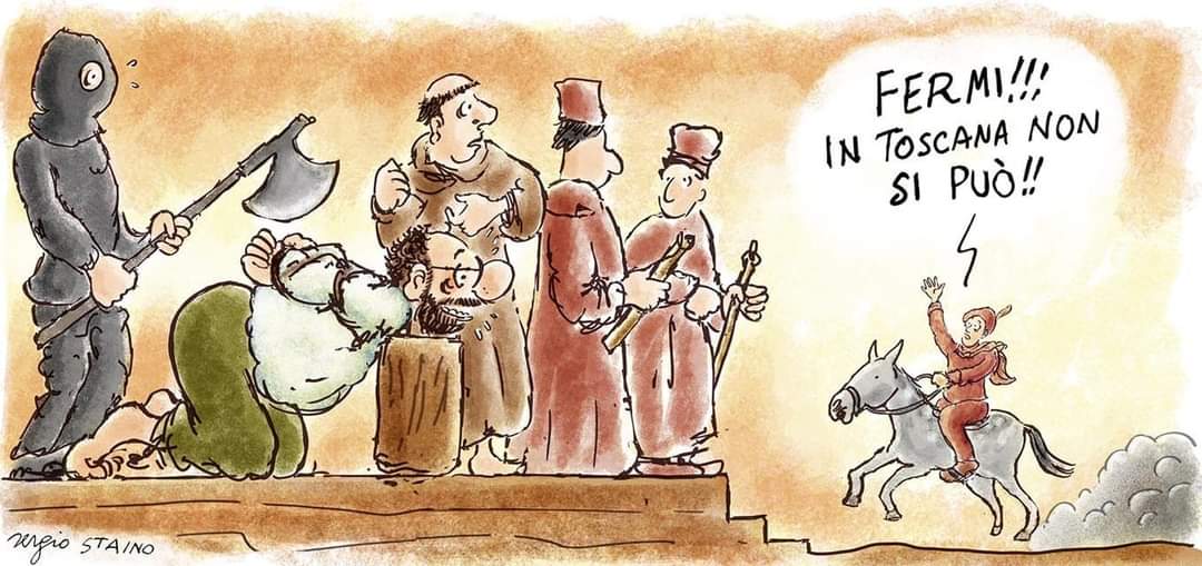 Come sottolineato dal vicepresidente del Consiglio regionale, Stefano Scaramelli, “è corretto che la nostra Assemblea ricordi la figura di Staino, proprio con la vignetta che ci regalò due anni fa, in occasione della Festa della Toscana, dedicata alla Libertà di espressione: ‘Fermi. In Toscana non si può’”. Questo il deciso monito, che caratterizzava la sua illustrazione satirica, mentre il suo ‘Bobo’ stava per essere giustiziato, in una Toscana, appunto, dove la pena di morte era stata da molto tempo abolita.