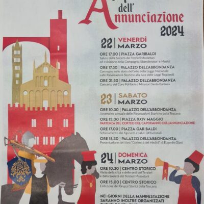 “La scelta di organizzare ogni anno in una città diversa il Capodanno dell’Annunciazione – ha detto il presidente della Regione Toscana Eugenio Giani – ha riscosso un grande successo e lo dimostra l’invasione di figuranti prevista a Massa Marittima. Questo evento rappresenta sia una grande festa, sia un importante momento di riflessione e costruzione riguardo al futuro del mondo della rievocazione storica. E’ stata inoltre coniata una spendida medaglia celebrativa per festeggiare questo evento, durante il quale avremo anche l’occasione di annunciare gli assegnatari del finanziamento di 500.000 euro con il quale ogni anno, dal 2021 ad oggi, la Regione Toscana sostiene le manifestazioni di rievocazione storica organizzate da Enti locali o associazioni”. “La Toscana – ha concluso Giani – da sempre è orgogliosa del proprio Capodanno, basti pensare che già Dante fa iniziare il viaggio salvifico della Divina Commedia proprio in questa occasione e che, nonostante l’adozione nel 1582 del calendario gregoriano che fissava l’inizio dell’anno al 1º gennaio, importanti città toscane come Pisa, Firenze, Lucca, Prato e Siena mantennero la tradizione di iniziare il loro anno nuovo il 25 marzo. Oggi noi celebrando il Capodanno toscano mettiamo al centro la nostra storia, la nostra cultura, mostriamo che il nostro patrimonio artistico non è fatto solo da musei e opere d’arte ma anche da un elemento ‘vivo’, persone che riescono a far rivivere le fasi storiche che hanno caratterizzato l’anima della Toscana e la sua immagine nel mondo”.