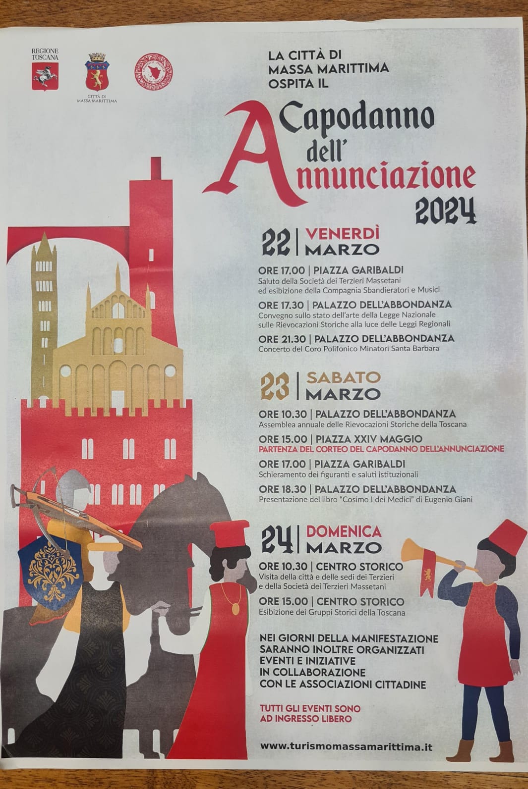 Il 25 marzo, Capodanno dell’Annunciazione, è la data nella quale fino al 1749 in Toscana si faceva iniziare il nuovo anno. Per ricordare questa storica data migliaia di figuranti in costume storico, provenienti da tutta la nostra regione, confluiranno a Massa Marittima nel weekend immediatamente precedente, trasformando di fatto la città nella capitale della rievocazione storica d’Italia. Nelle piazze della città si terranno presentazioni delle principali discipline legate alle manifestazioni storiche: dimostrazioni di sbandieratori e arcieri, danze rinascimentali e, naturalmente, balestrieri. Molti anche i momenti di approfondimento storico-culturale.