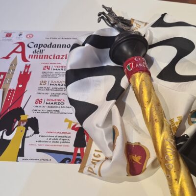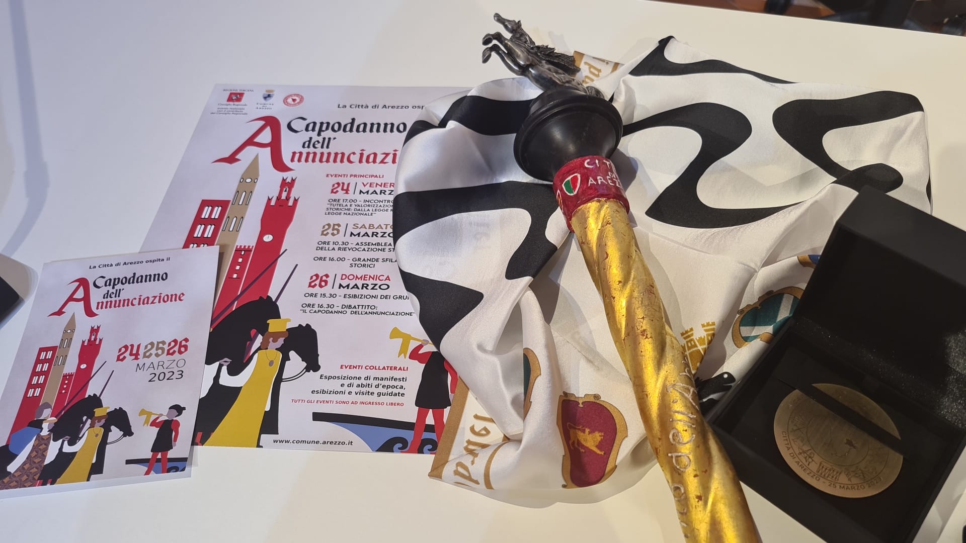Il programma si apre venerdì 24 marzo proprio con l’incontro sulla “Tutela e valorizzazione delle Rievocazioni Storiche: dalla Legge regionale alla Legge Nazionale” (alle 17, nella Sala Vasariana, in piazza del Praticino) e con il saluto (alle 19.30 in piazza Grande) con il saluto della Giostra del Saracino. Sabato 25 marzo è il giorno del Corteo del Capodanno dell’Annunciazione, che partirà alle 16 da via Roma, sfilerà per le vie del centro, fino allo schieramento delle rappresentative sul sagrato della Cattedrale. Nella giornata di sabato, in programma anche l’Assemblea annuale Rievocazione Storica Toscana (alle 10.30 nella Sala Vasariana) e un annullo filatelico. Domenica 26 marzo, alle 15.30, le esibizioni dei gruppi storici della Toscana nelle piazze del centro di Arezzo, e un incontro/dibattito sul tema “Il Capodanno dell’Annunciazione”, e alle 16.30 nella Biblioteca città di Arezzo. Nei tre giorni, un ricco calendario di eventi collaterali, illustrato dall’assessore del Comune di Arezzo, Federico Scapecchi. Esposizione di manifesti, abiti d’epoca e accessori al Percorso Espositivo “I Colori della Giostra”; “Arezzo ti incanta”, camminata notturna alla scoperta di palazzi e vedute inconsuete del centro storico (il 25 marzo alle 20.30); “L’annunciazione ad Arezzo”, visita guidata in programma il 26 marzo alle 9.30; “Il tempo antico in Toscana”, esposizione all’interno del Museo dei Mezzi di Comunicazione. “È un programma ambizioso, una festa per Arezzo e per tutta la Toscana – dice l’assessore –. Speriamo in una grande partecipazione, i dati che abbiamo già oggi sono ottimi”. E consegna uno scettro realizzato per l’occasione, “che ricorda quello del Maestro di campo, sormontato dal Pegaso in argento. È il nostro dono, anche per le edizioni future nelle altre città della Toscana”.