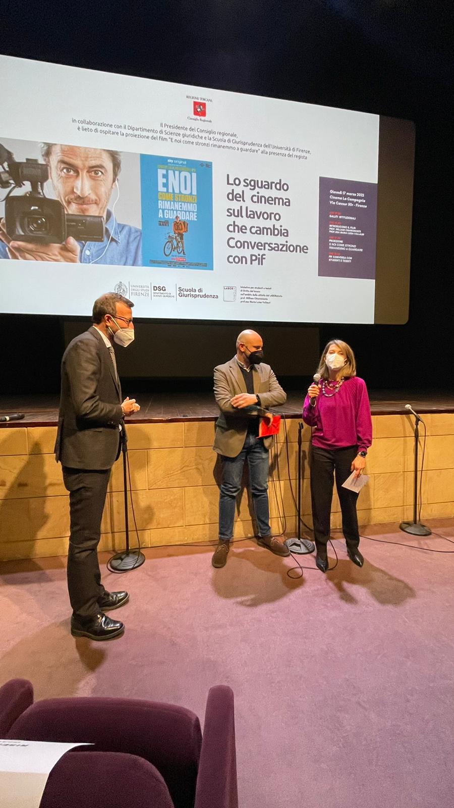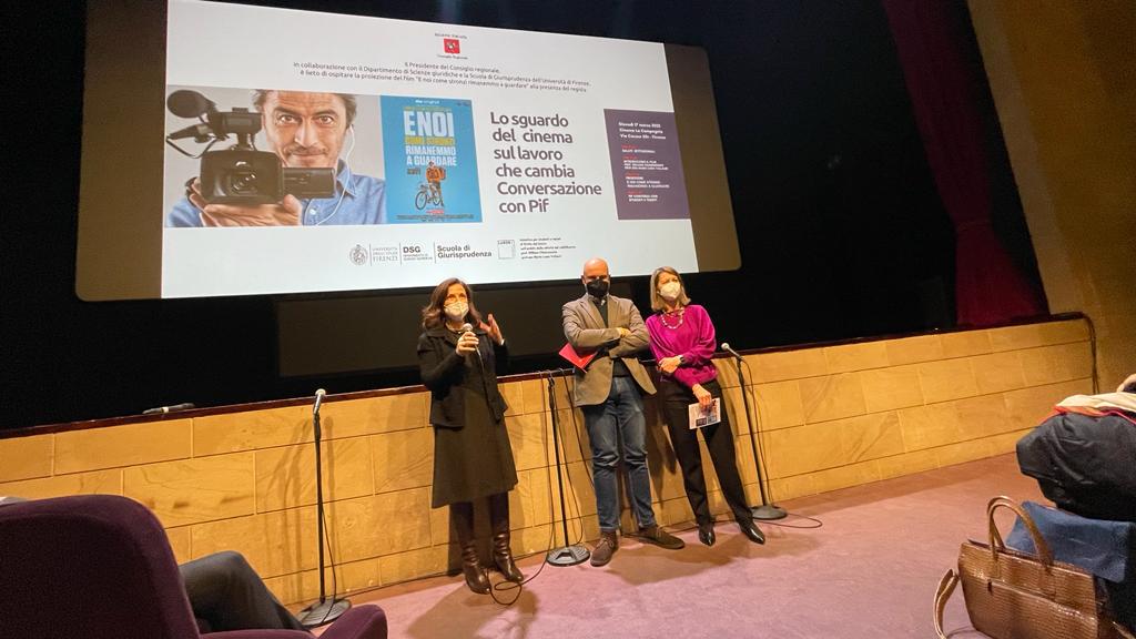 Giachi ha ringraziato William Chiaromonte e Maria Luisa Vallauri professori associati di Diritto del lavoro presso il dipartimento di Scienze giuridiche dell’Università di Firenze. La proiezione del film prima e il confronto che seguirà con Pif rientrano nell’offerta formativa ed educativa che entrambi rivolgono agli studenti.