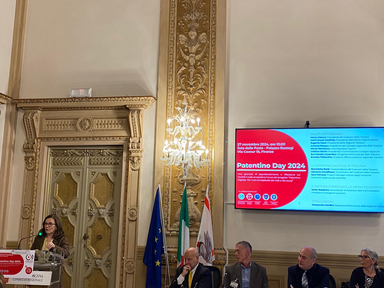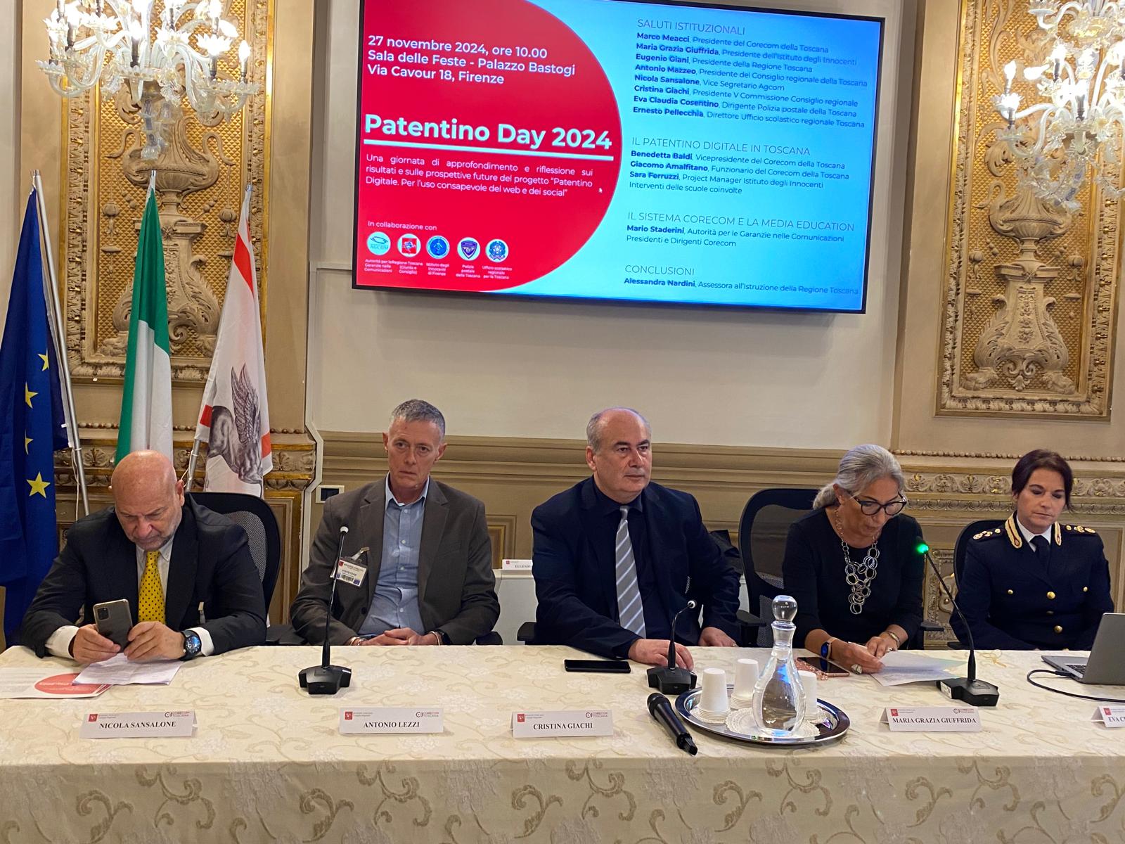 Firenze – Si rinnova e si rafforza l’impegno del Corecom della Toscana per il Patentino digitale, progetto di formazione e educazione alla cittadinanza digitale rivolto agli studenti di prima media, che quest’anno raddoppia il numero di classi delle scuole toscane coinvolte, da 25 a 50. Un progetto realizzato dal Corecom della Toscana in collaborazione con la Regione Toscana, l’Istituto degli Innocenti, la Polizia Postale e l’Ufficio scolastico regionale, e a cui oggi è stato dedicato il Patentino Day, giornata di approfondimento e riflessione sui risultati e sulle sue prospettive future. All’iniziativa, che si è svolta a palazzo Bastogi, sono intervenuti, tra gli altri Marco Meacci, presidente del Corecom della Toscana, Maria Grazia Giuffrida, presidente dell’lstituto degli Innocenti, Cristina Giachi, presidente della Commissione Cultura del Consiglio regionale, Eugenio Giani, presidente della Regione Toscana, Antonio Lezzi, componente del gruppo di supporto Pnrr alle scuole dell’Ufficio scolastico regionale, Nicola Sansalone, vice segretario di Agcom, Mario Staderini, di Agcom, Eva Claudia Cosentino, dirigente Polizia postale della Toscana. Erano presenti le classi prima A e prima B dell’Istituto comprensivo Guido Marcelli di Foiano della Chiana. Intervenuta da remoto l’assessora all’Istruzione Alessandra Nardini. In platea anche l’assessore regionale alla transizione digitale, Stefano Ciuoffo.