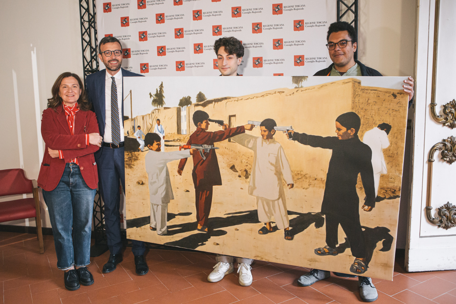 “La mostra raccoglieva opera di artisti che si sono cimentati con l’idea della guerra – ha detto la presidente della commissione Cultura, Cristina Giachi. – Il dono di un’opera che il Consiglio regionale riceve per aver sostenuto la mostra e aver realizzato il catalogo ci emoziona. Ci hanno regalato una delle opere più belle, ma anche più inquietanti, che raffigura dei ragazzi che giocano con pistole giocattolo. Sarebbe un’immagine normale, se non intuissimo che il gioco si svolge in uno scenario di guerra vera. Spero che il Consiglio sappia valorizzarla al meglio e renderla visibile, affinché scuota molte coscienze”.