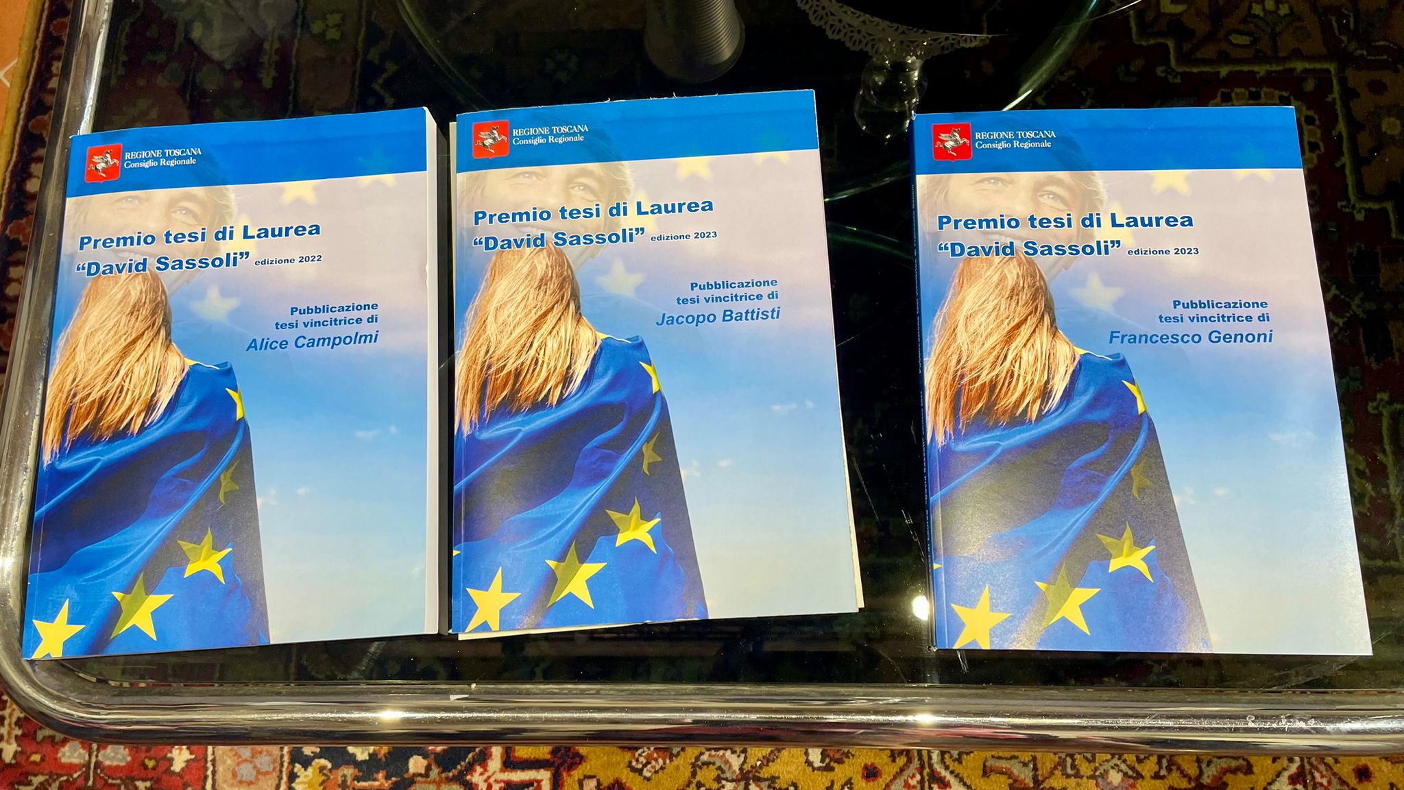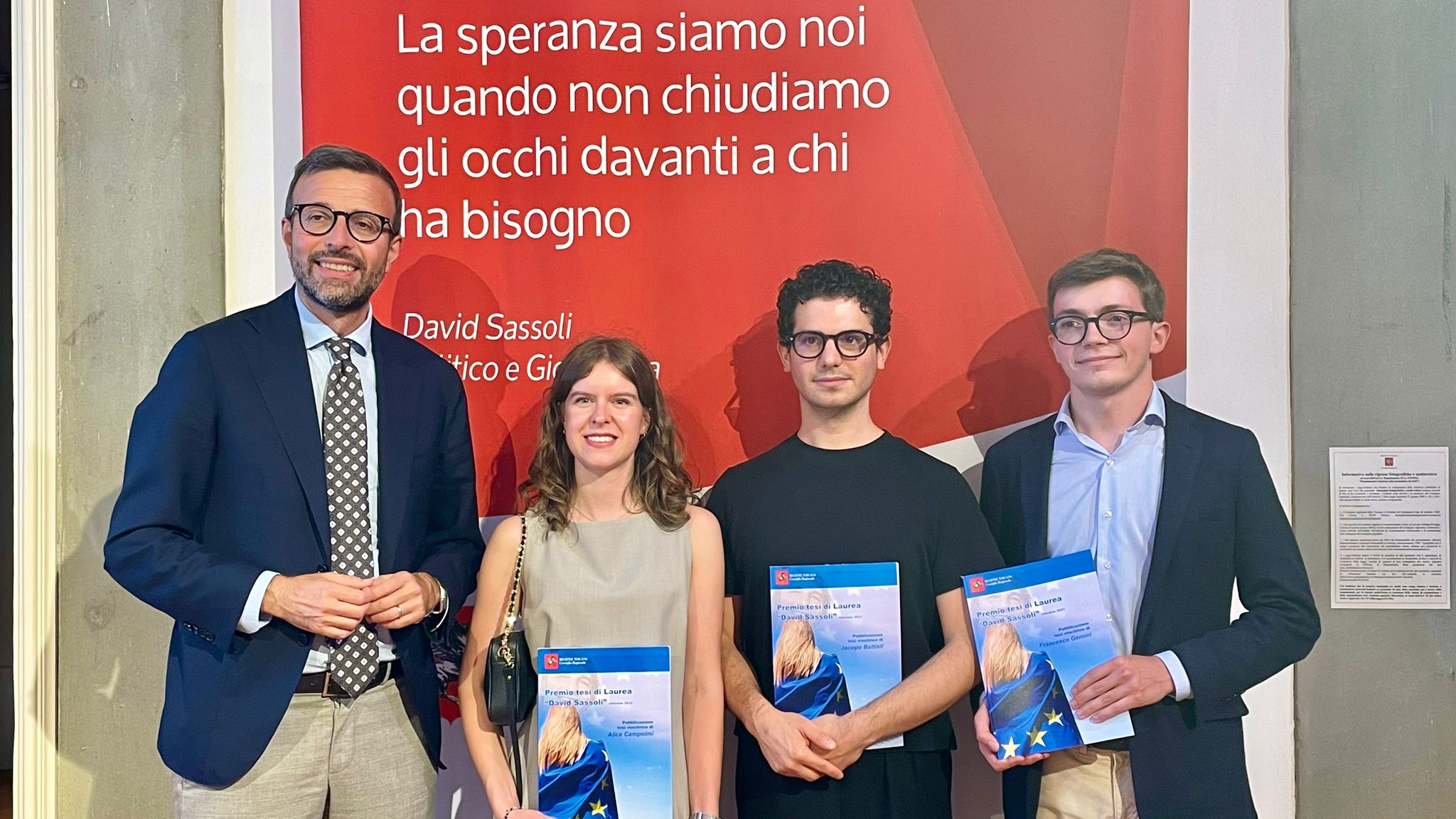 Le tesi da oggi sono libri realizzati dal Consiglio regionale e messi a disposizione della collettività per promuovere i valori di unità e solidarietà dell’Europa e la ricerca per il progresso comune nella memoria di David Sassoli. Insieme ad Alice Campolmi, vincitrice del 1° premio dell’edizione 2022 erano presenti Jacopo Battisti, vincitore del 1° premio edizione 2023 e Francesco Genoni vincitore del 2° premio ex-aequo edizione 2023.