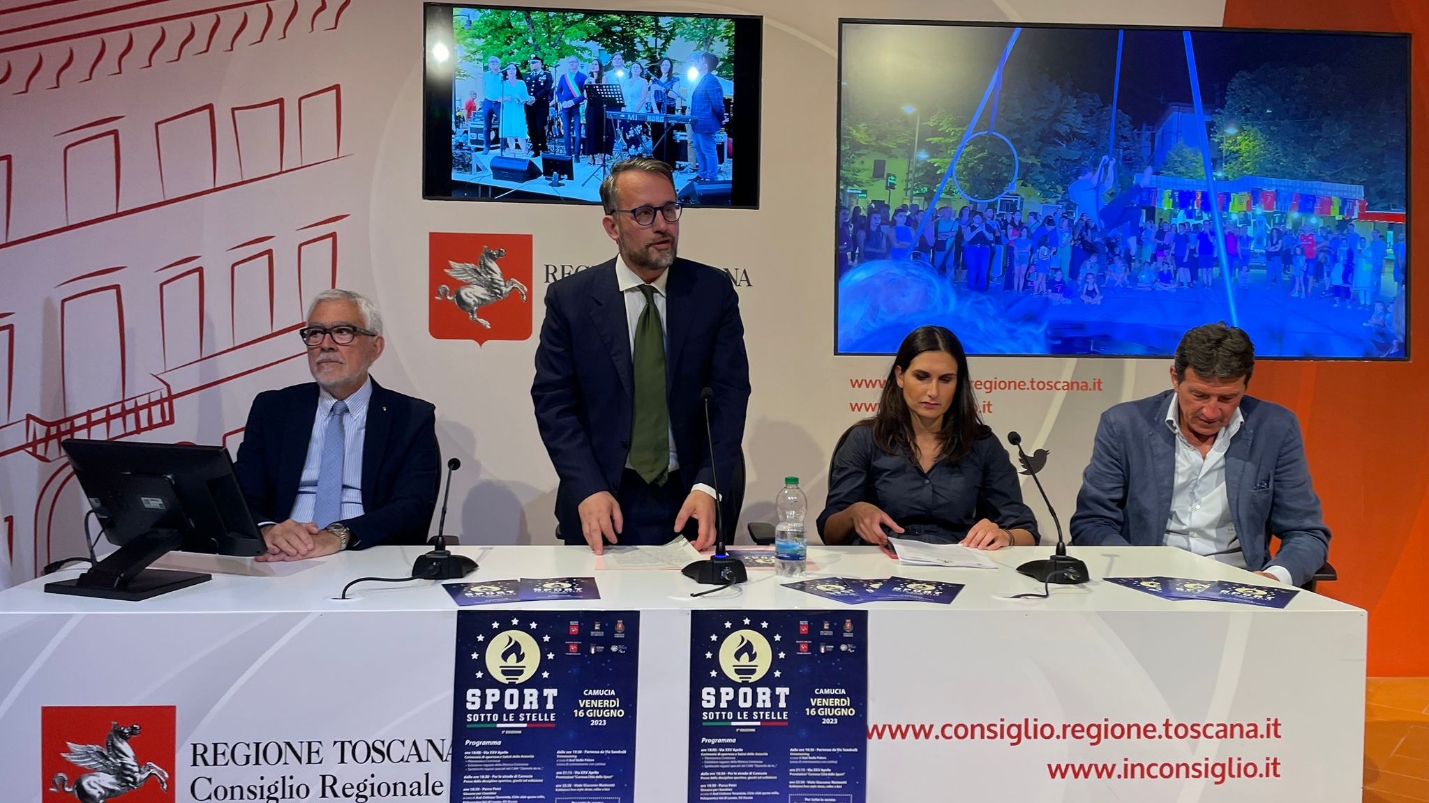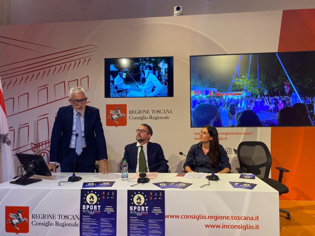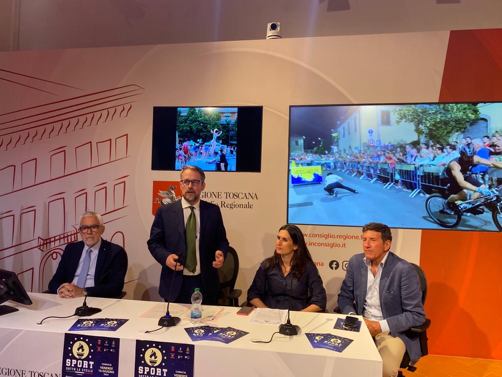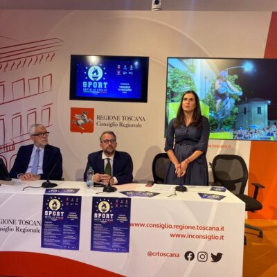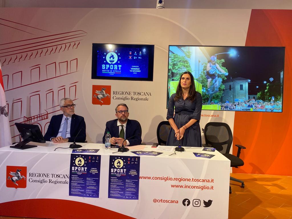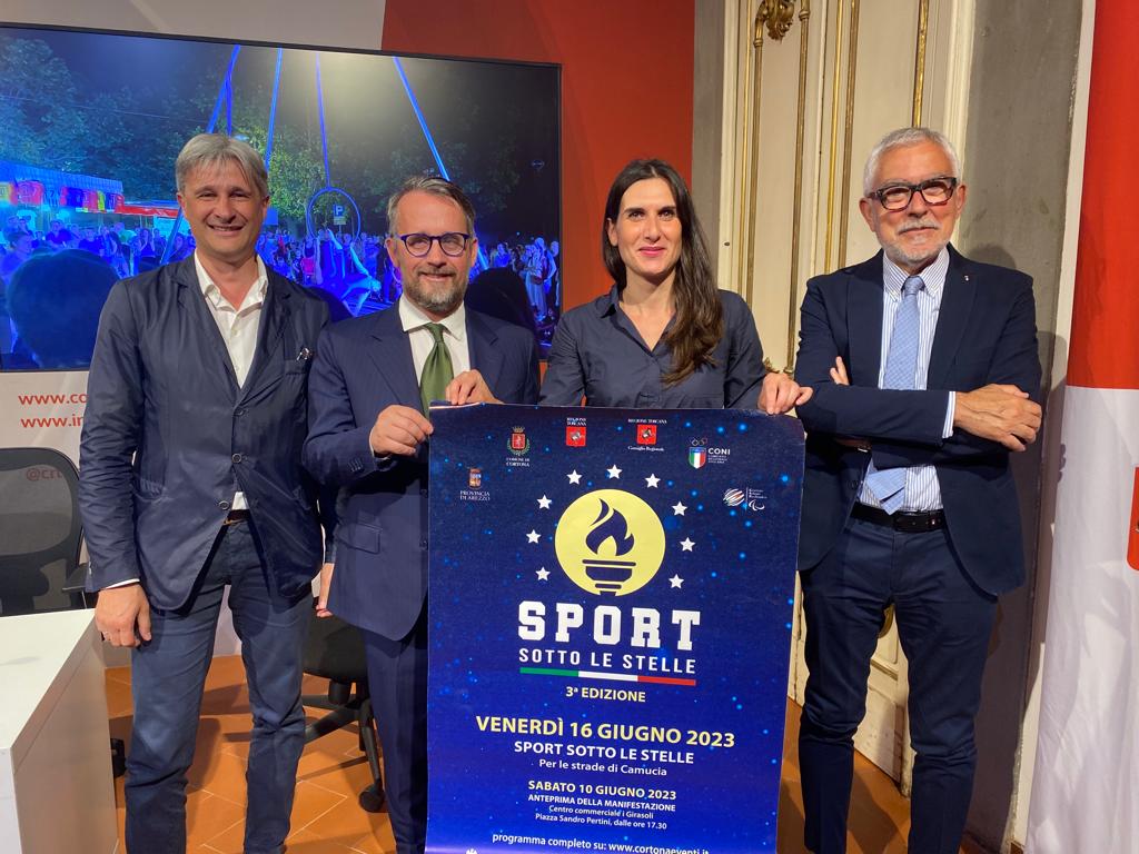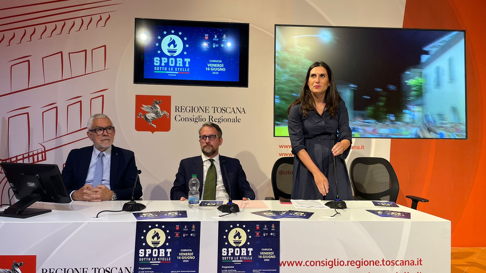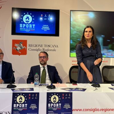 “ ‘Sport sotto le stelle’ si sta consolidando come una formula vincente che riesce coniugare lo sport al sociale e al vivere quotidiano delle attività commerciali – ha affermato il vicepresidente del Consiglio regionale Marco Casucci nel corso della conferenza stampa che si è tenuta questa mattina a palazzo del Pegaso – La sera del 16 giugno Camucia, il centro più popoloso del Comune di Cortona, sarà un tripudio di suoni, di colori, di sapori”. “Sono contento di avere accolto a palazzo del Pegaso l’Amministrazione comunale di Cortona e il Coni – ha aggiunto Casucci – per ribadire ancora una volta che il Consiglio regionale si apre al territorio e valorizza le iniziative che si svolgono anche nelle frazioni, non solo nei capoluoghi e nei principali borghi. Questa concezione di Toscana diffusa, che deve essere portata avanti in modo omogeneo, prende corpo anche in queste occasioni”.