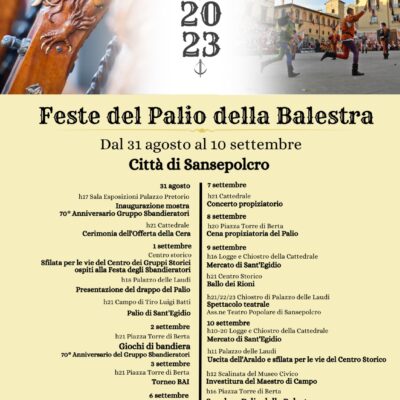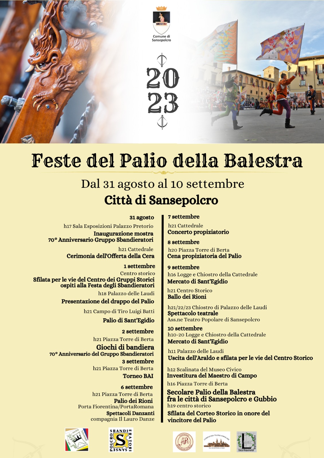 Per il 70esimo anniversario del Gruppo Sbandieratori, sabato 2 settembre in piazza Torre di Berta andranno in scena i Giochi di bandiera, mentre il 3 settembre si disputerà il torneo BAI (Balestra Antica Italiana) a cui parteciperanno i balestrieri di Sansepolcro, Gubbio e Assisi. Si continua mercoledì 6 col Palio dei Rioni Porta Fiorentina/PortaRomana e con gli spettacoli danzanti a cura della compagnia ‘Il Lauro Danze’. Il Concerto propiziatorio e la cena propiziatoria del Palio si terranno rispettivamente il 6 e il 7 settembre. Si continua il 9 settembre alle Logge e Chiostro della Cattedrale col Mercato di Sant’Egidio a cura dell’associazione Il Rinascimento nel Borgo a cui seguirà il Ballo dei Rioni. La sera, nel Chiostro di palazzo delle Laudi, lo spettacolo teatrale dell’associazione Teatro popolare di Sansepolcro.