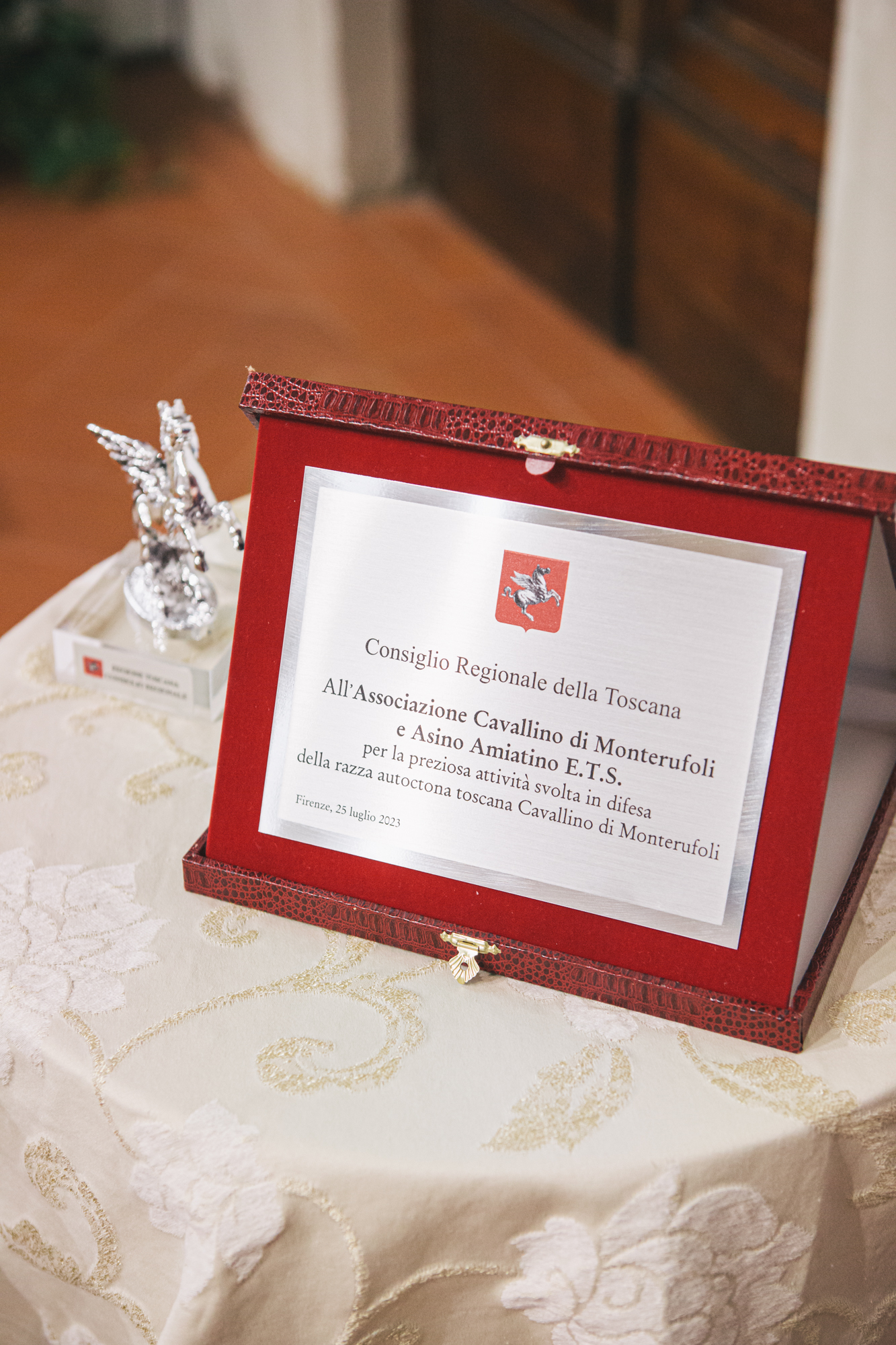 Firenze – Una targa del Consiglio regionale all’Associazione Cavallino di Monterufoli e Asino Amiatino E.T.S., “per la preziosa attività svolta in difesa della razza autoctona toscana Cavallino di Monterufoli”. È stato il presidente dell’Assemblea toscana, Antonio Mazzeo, a consegnare il riconoscimento nelle mani di Michele Della Pace, presidente dell’associazione, questa mattina, martedì 25 luglio, nella sala del Gonfalone del palazzo del Pegaso.