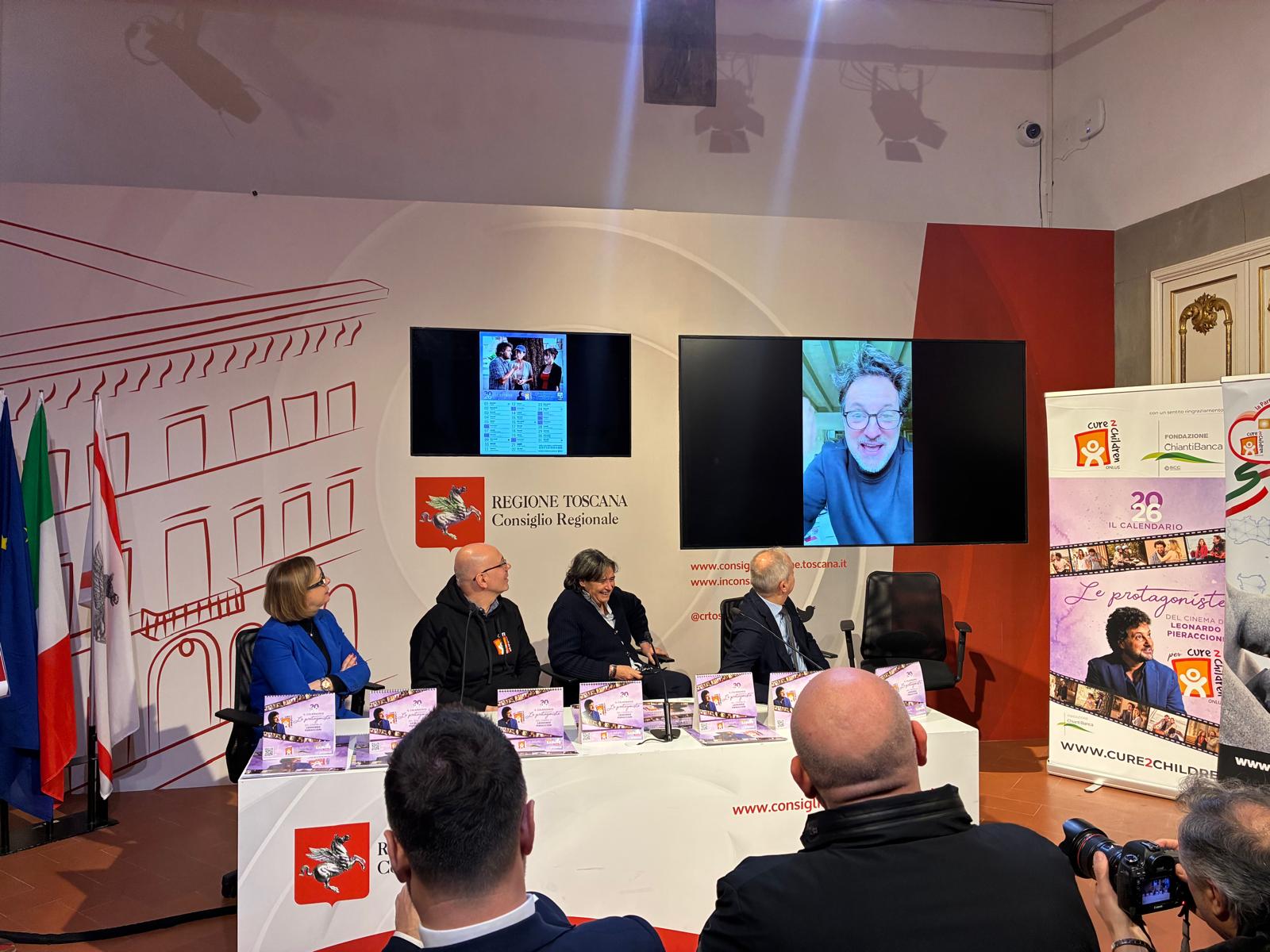 Firenze – La Fondazione Cure2Children ha presentato oggi, martedì 13 gennaio, nel Media Center Sassoli di palazzo del Pegaso, il calendario 2026 ‘Le Protagoniste del Cinema di Leonardo Pieraccioni’. Un’iniziativa di solidarietà che celebra l’eccellenza del cinema italiano al femminile per sostenere i bambini malati di cancro e si inserisce nel contesto della costante attenzione che l’Assemblea legislativa toscana rivolge verso le attività della Fondazione.