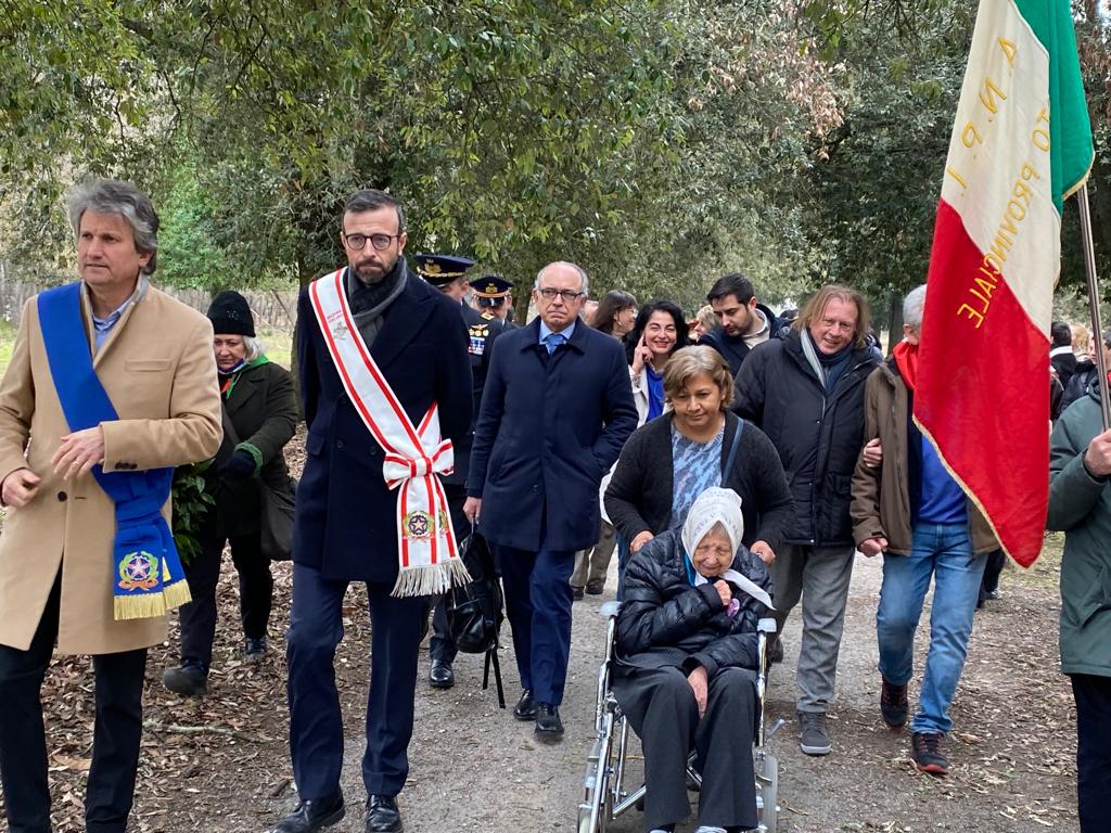 Firenze – Una corona di alloro sulla targa che ricorda l’infausta firma delle leggi razziali è stata deposta questa mattina, venerdì 17 febbraio, nel Parco di San Rossore alla presenza di Vera Vigevani Jarach, attivista e scrittrice, che ha vissuto la discriminazione degli ebrei in Italia, la Shoah e la tragedia dei desaparesidos in Argentina. Una cerimonia che si è tenuta nel luogo che ha segnato l’inizio della sua dolorosa vicenda e che ha visto, a pochi metri dalla targa, anche la messa a dimora di un albero di melograno in memoria di Ettore Felice Camerino, il nonno di Vera, deportato e ucciso a Auschwitz nel 1943, senza una tomba che potesse accogliere il suo corpo. Nell’occasione, che si inserisce nell’ambito delle iniziative volute dal Consiglio regionale e realizzate con la collaborazione dell’Associazione 24marzo Onlus, Vera Vigevani ha potuto nuovamente dialogare con i giovani: a incontrarla nella Sala Gronchi la Consulta Provinciale degli studenti di Pisa e i rappresentanti degli istituti delle scuole superiori della città toscana. L’evento è stato organizzato grazie alla collaborazione dell’Ente Parco Migliarino-San Rossore-Massaciuccoli, della Provincia di Pisa e dell’Ufficio scolastico territoriale di Pisa.
