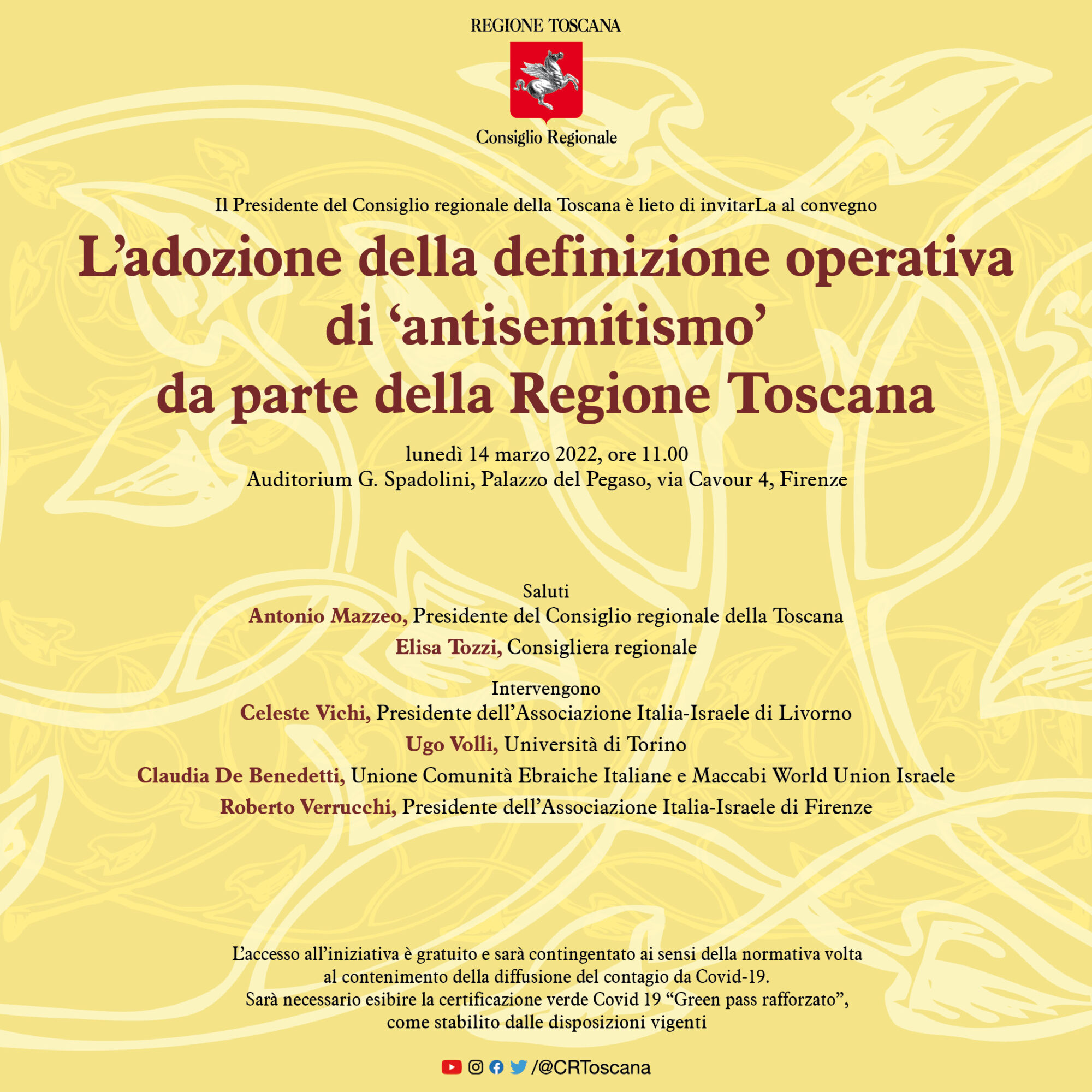 Firenze – Un convegno dedicato a “L’adozione della definizione operativa di ‘antisemitismo’ da parte della Regione Toscana”; l’appuntamento è per lunedì 14 marzo, alle ore 11.00, in Auditorium Giovanni Spadolini, a Palazzo del Pegaso (via Cavour 4, Firenze).