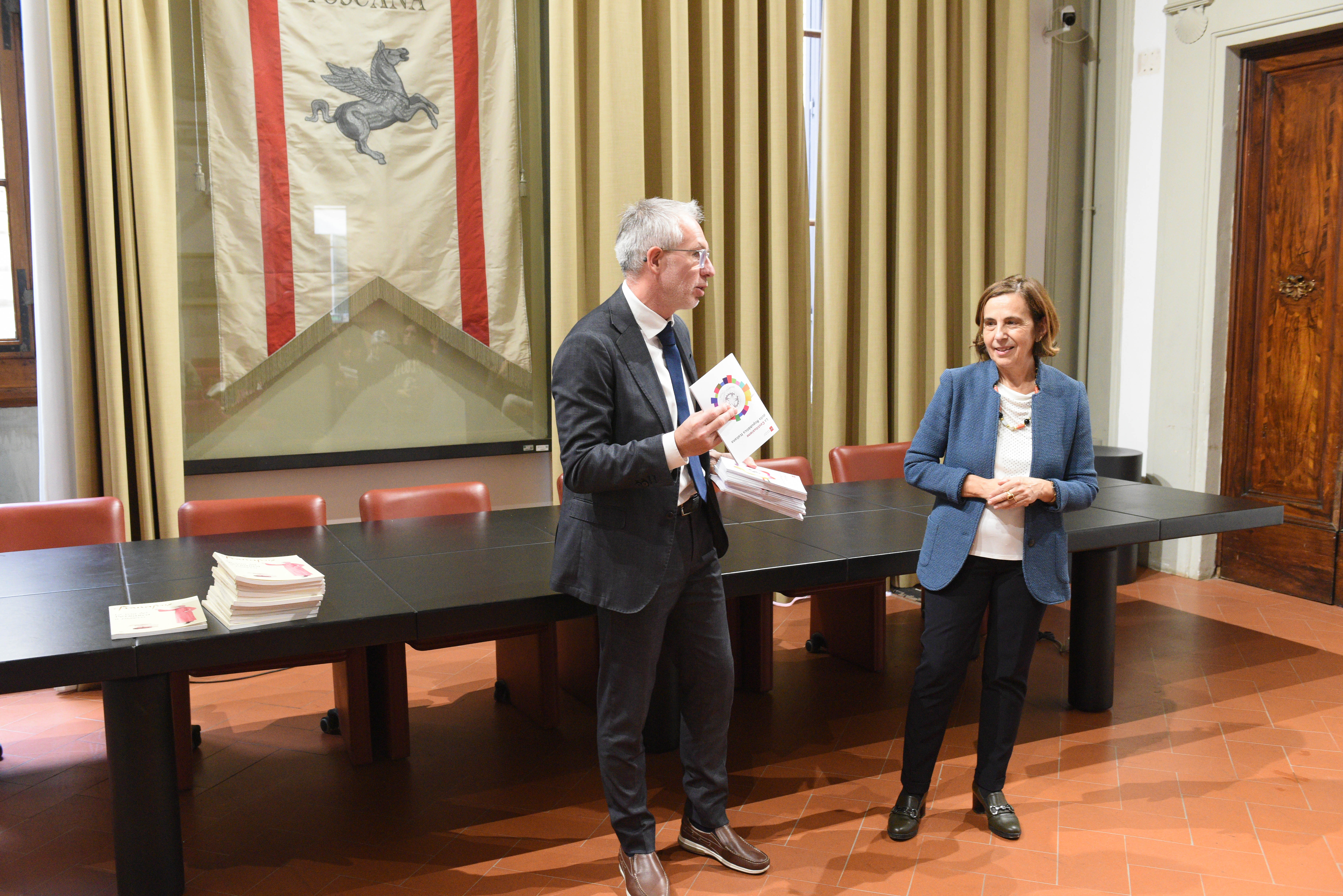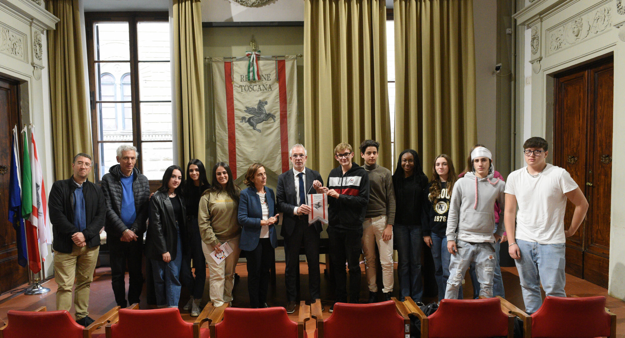 Durante l’incontro il vicepresidente Scaramelli e la consigliera regionale Anna Paris (Pd) hanno consegnato alle studentesse e agli studenti un gagliardetto e la pubblicazione edita dal Consiglio regionale con lo Statuto della Regione e la Costituzione. Al termine i ragazzi del Liceo Piccolomini hanno effettuato una visita guidata nel cuore di palazzo del Pegaso.