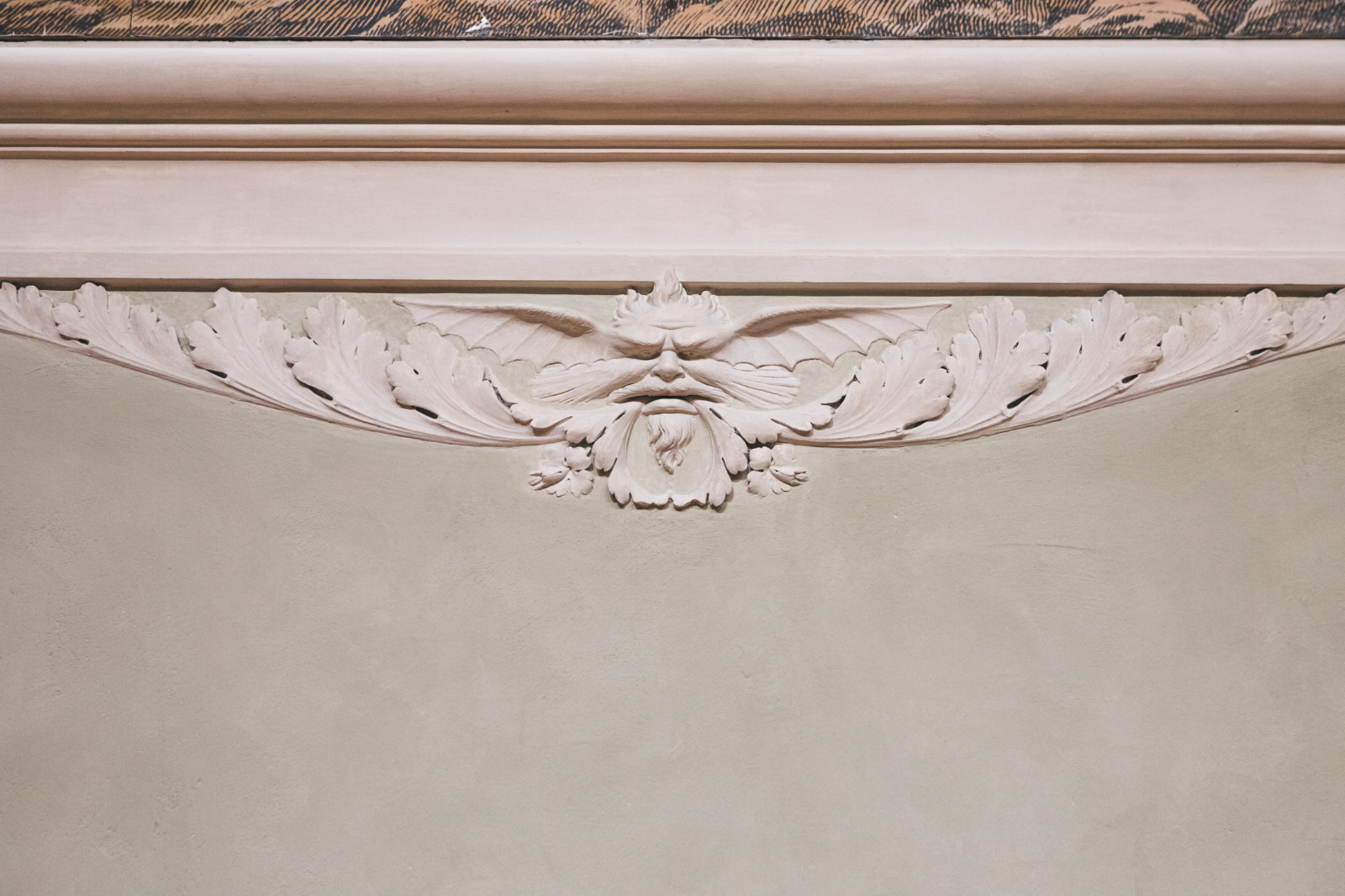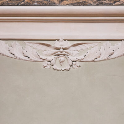 Visto il buono stato conservativo e la facilità con cui potevano essere rimesse in luce le superfici originali, è stato concordato con la Soprintendenza di procedere al ‘descialbo’ provvedendo a successive conguagliature cromatiche ove necessario. Eseguendo le attività di descialbo, sono stati ritrovati ulteriori decori, precedenti agli stucchi, nei sovrapporta. Visto lo stato conservativo dei suddetti decori più antichi e vista la finalità di restituire un apparato decorativo unitario della sala, è stato valutato con la Soprintendenza di documentare i ritrovamenti effettuati e di conservarli applicandovi coloriture reversibili.
