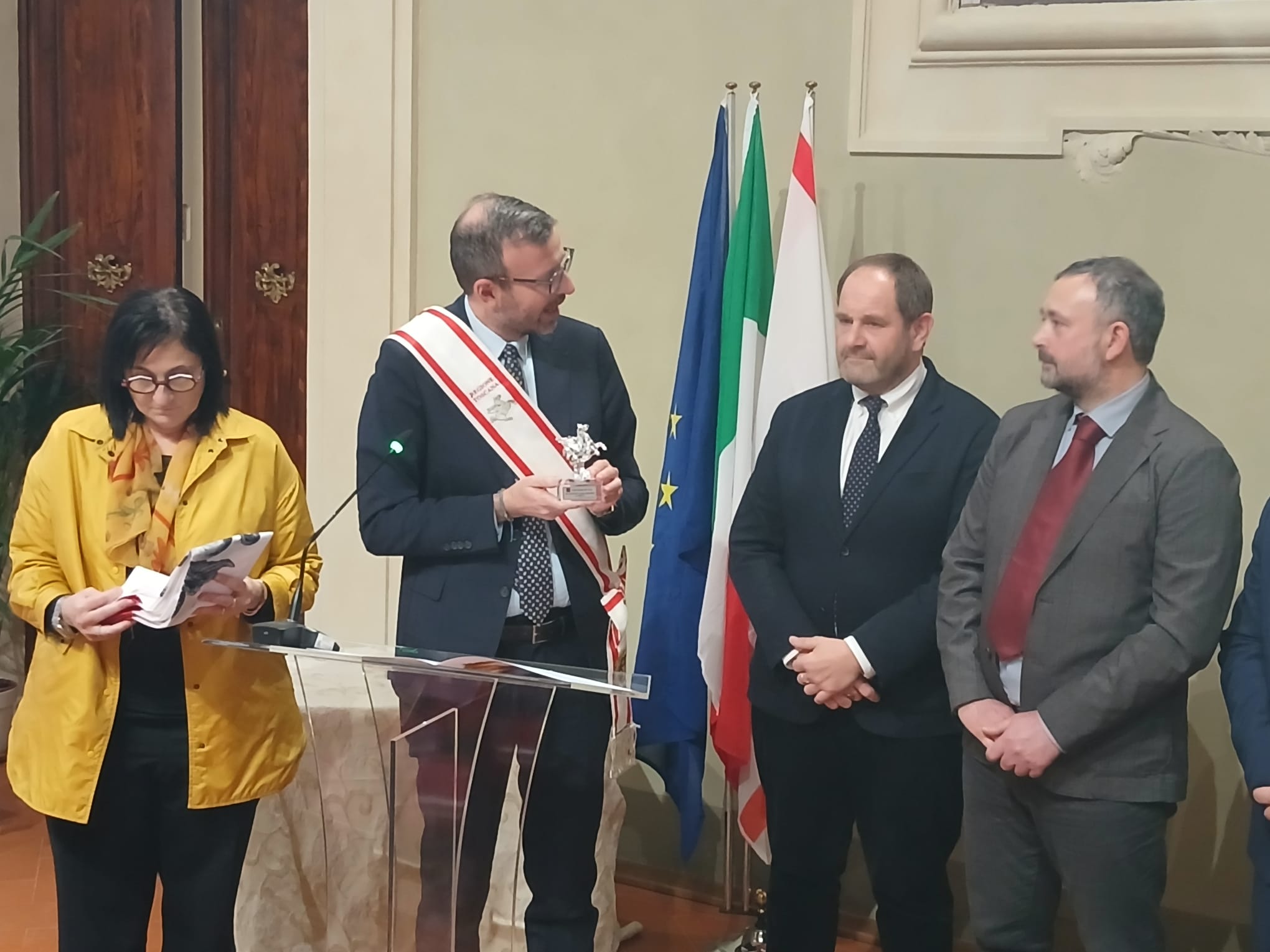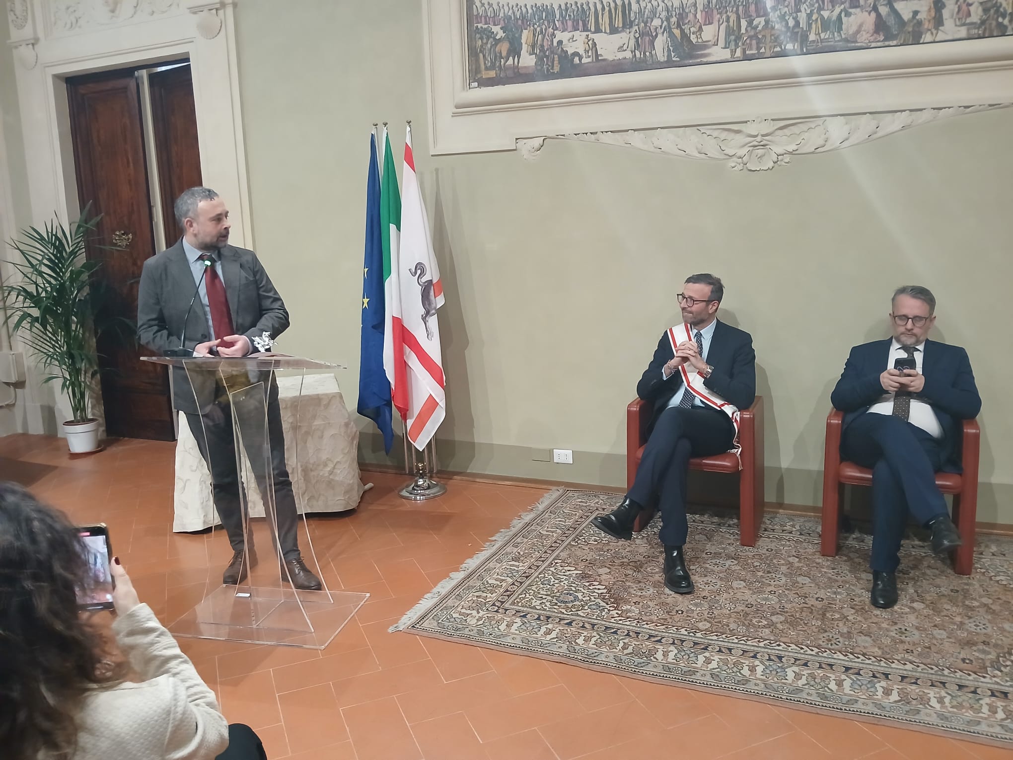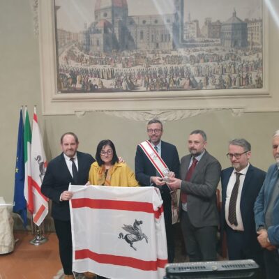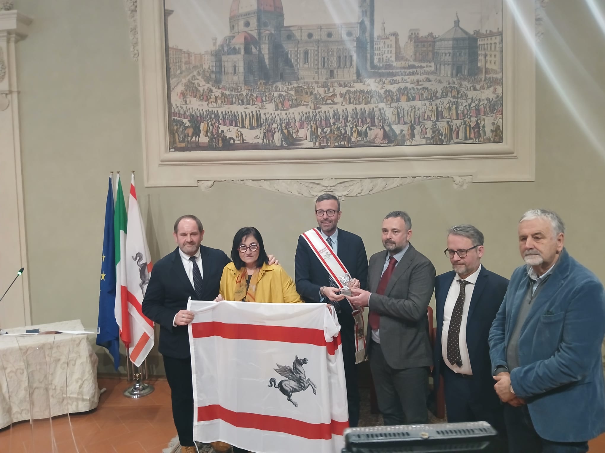 Il presidente del Consiglio regionale Antonio Mazzeo ha donato il Pegaso e la bandiera dell’ente al dirigente scolastico Renzo Izzi per l’importante ruolo della scuola nella formazione toscana in campo orafo