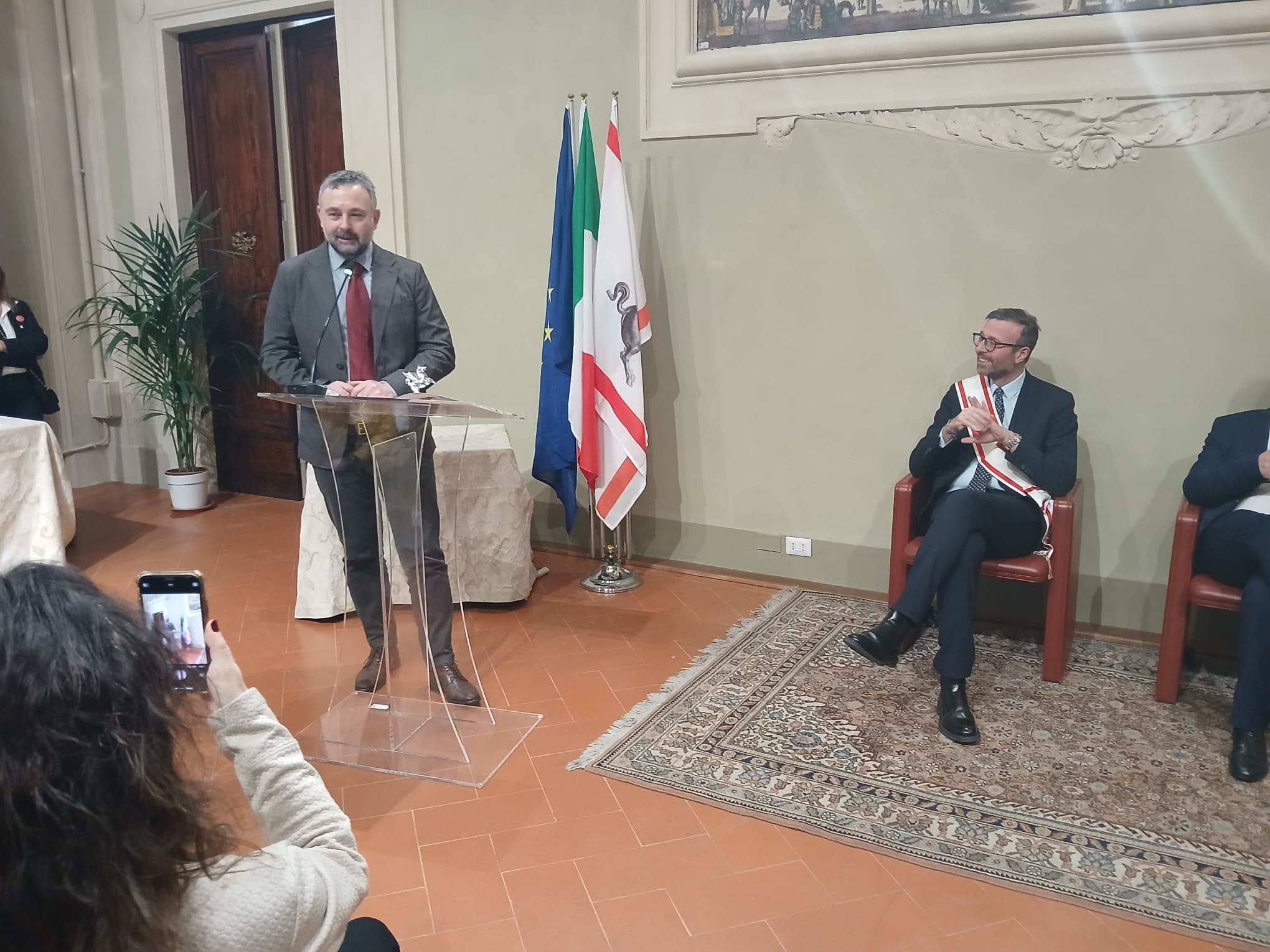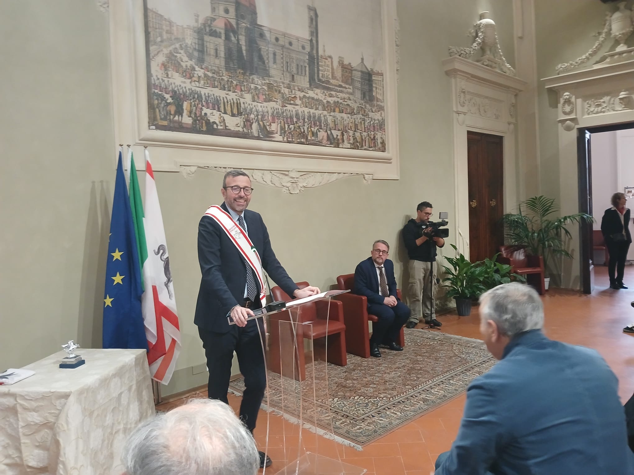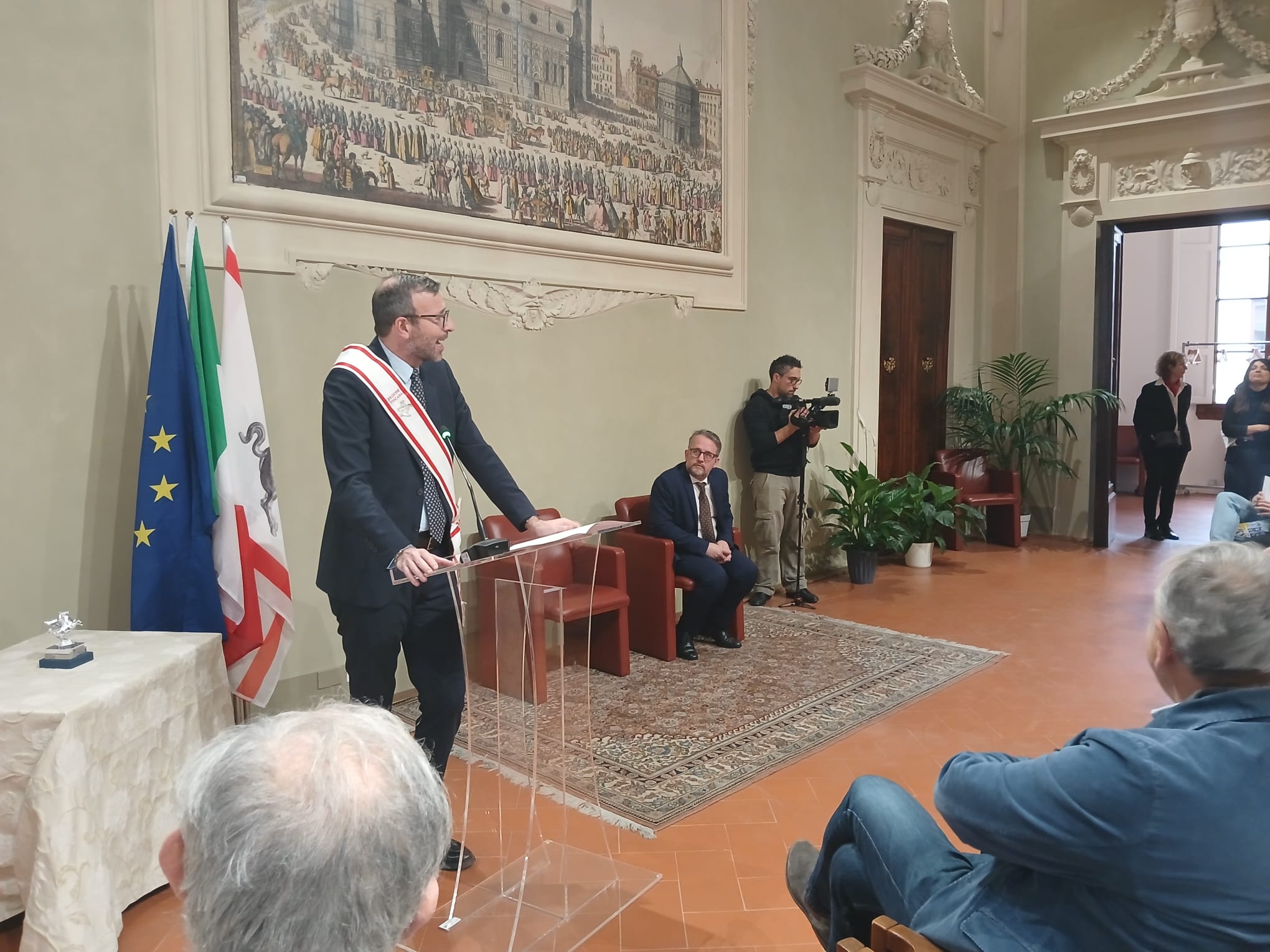 Il presidente del Consiglio regionale Antonio Mazzeo ha donato il Pegaso e la bandiera dell’ente al dirigente scolastico Renzo Izzi per l’importante ruolo della scuola nella formazione toscana in campo orafo