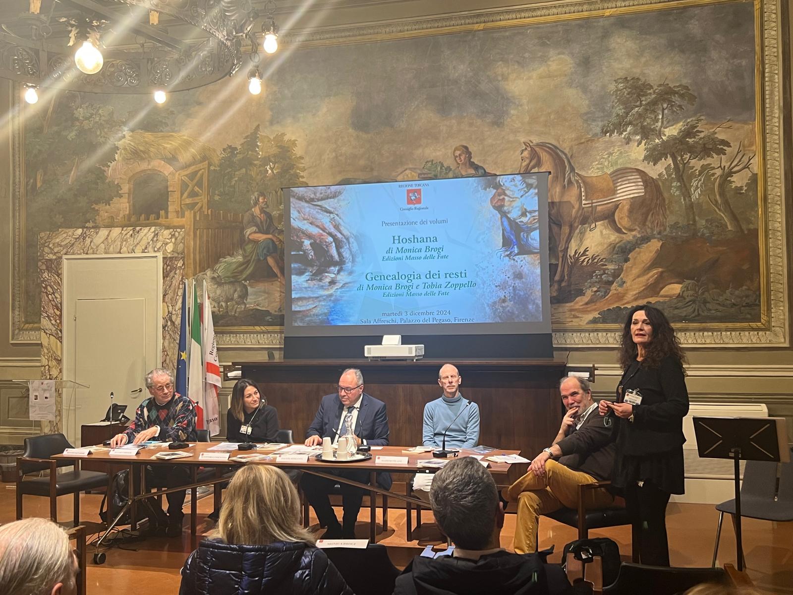 Firenze – “Due opere in cui ho messo tanto impegno e tanto coraggio, il coraggio di parlare e di dire la verità”. Così la psicologa, psicoterapeuta e scrittrice fiorentina Monica Brogi ha descritto i suoi due volumiHoshana” e “Genealogia dei resti”, scritto insieme a Tobia Zoppello (Edizioni Masso delle Fate) presentati ieri pomeriggio (martedì 3 dicembre) a Palazzo del Pegaso.