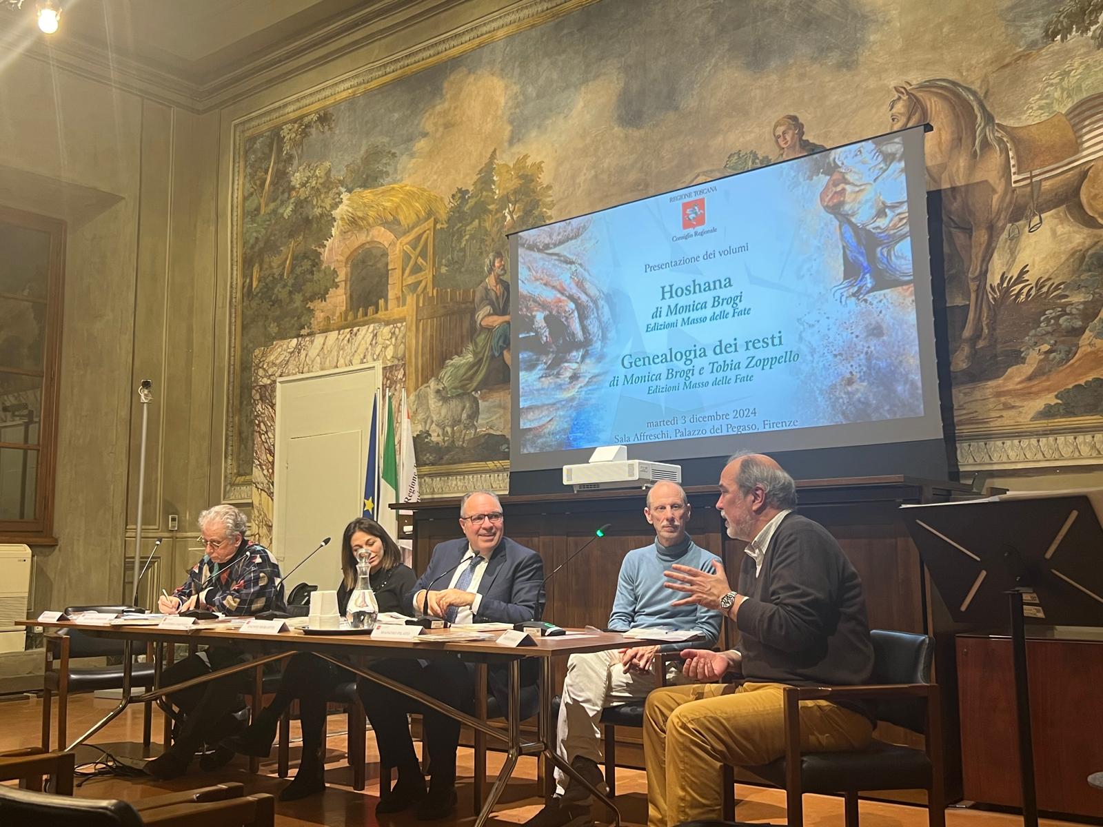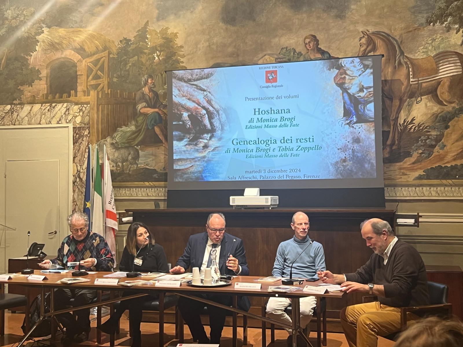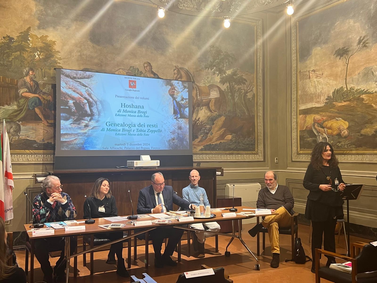 Firenze – “Due opere in cui ho messo tanto impegno e tanto coraggio, il coraggio di parlare e di dire la verità”. Così la psicologa, psicoterapeuta e scrittrice fiorentina Monica Brogi ha descritto i suoi due volumiHoshana” e “Genealogia dei resti”, scritto insieme a Tobia Zoppello (Edizioni Masso delle Fate) presentati ieri pomeriggio (martedì 3 dicembre) a Palazzo del Pegaso.