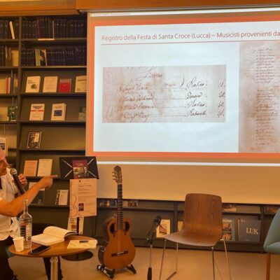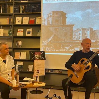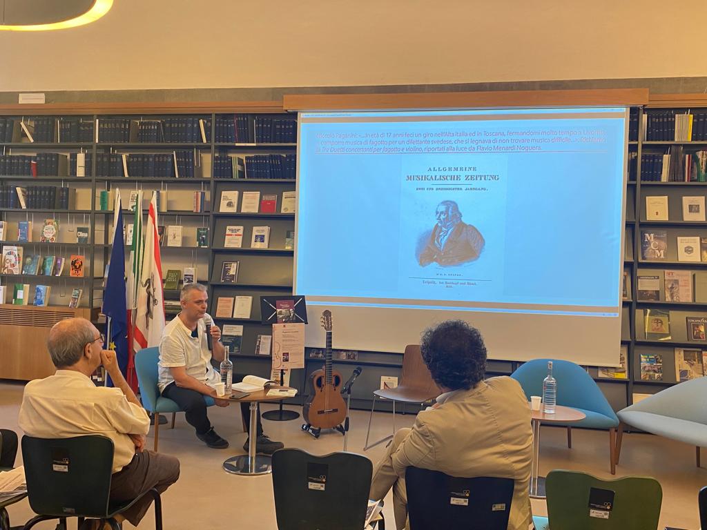 La presentazione è stata arricchita da intervalli musicali del Maestro di chitarra Michele Greci. “Per dare al pubblico la possibilità di entrare nel vivo della narrazione abbiamo pensato di proporre musiche del tempo, a partire da quelle di Ferdinando Carulli e Filippo Gragnani, per poi passare alle composizioni per chitarra di Paganini, tra cui l’Andantino variato e i Ghiribizzi”.