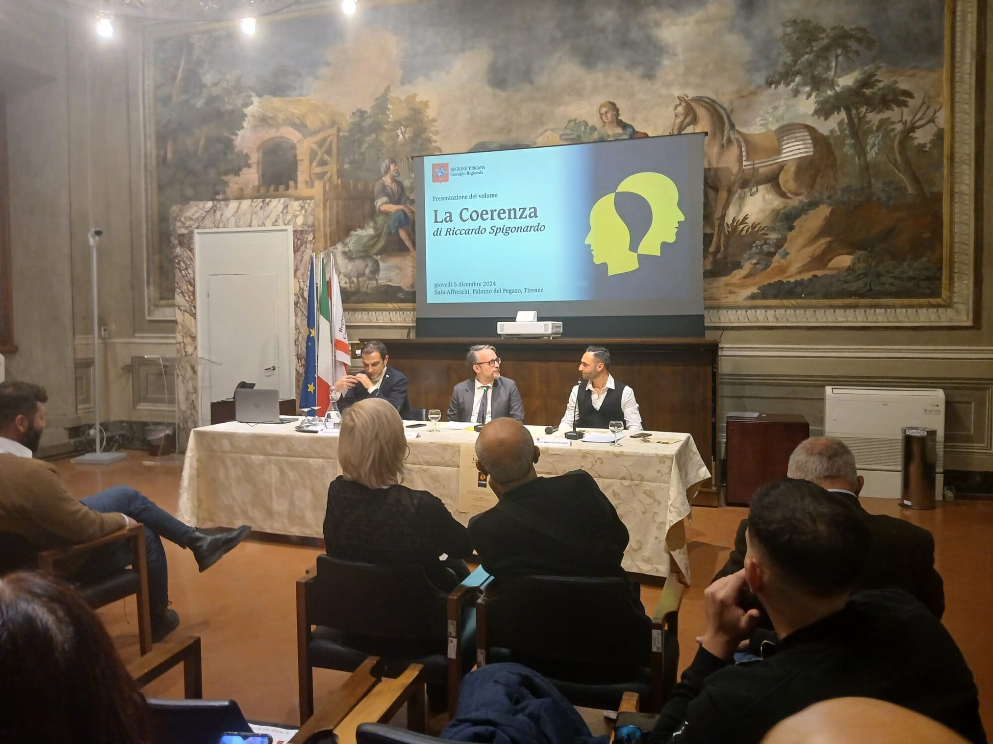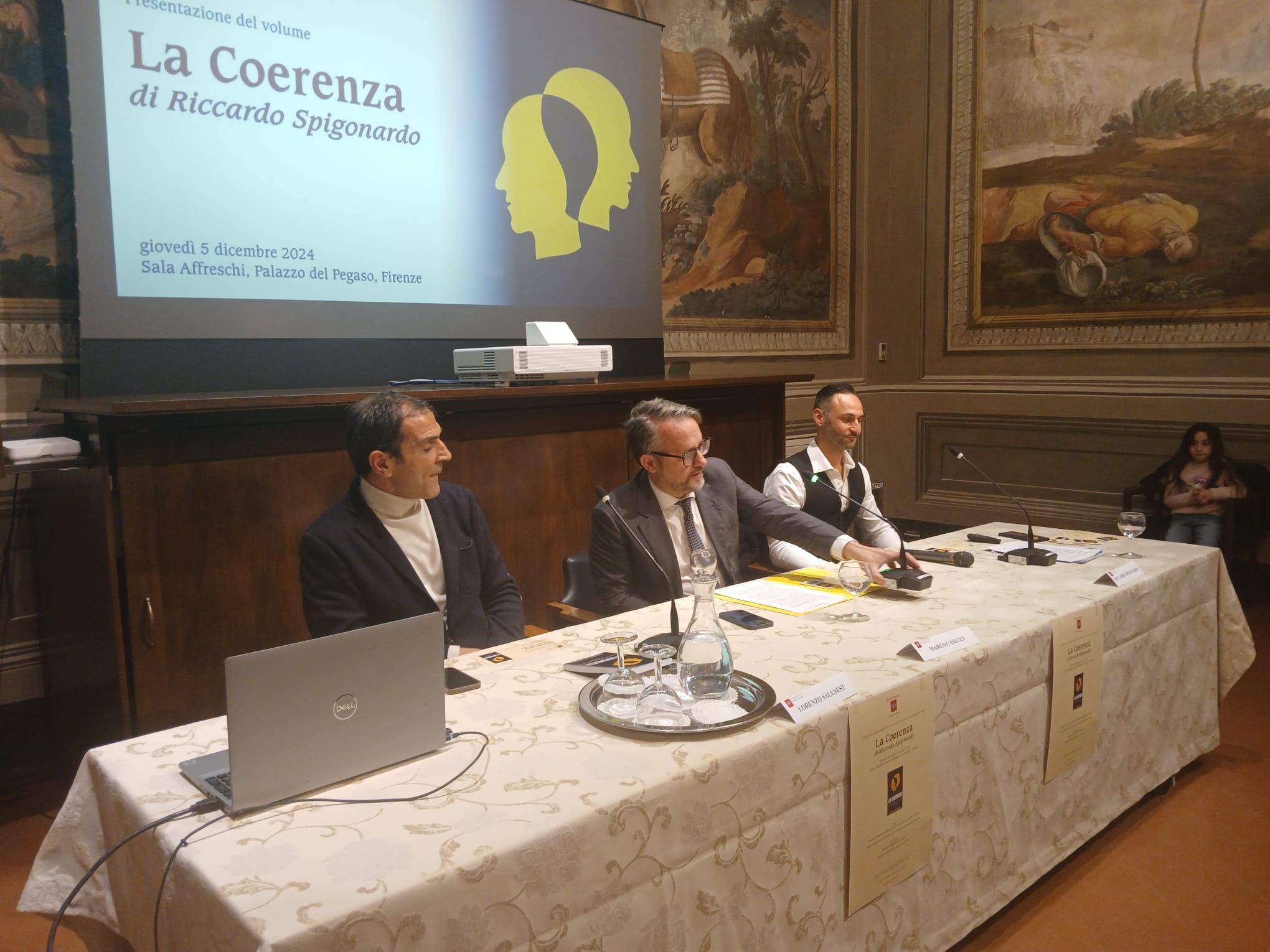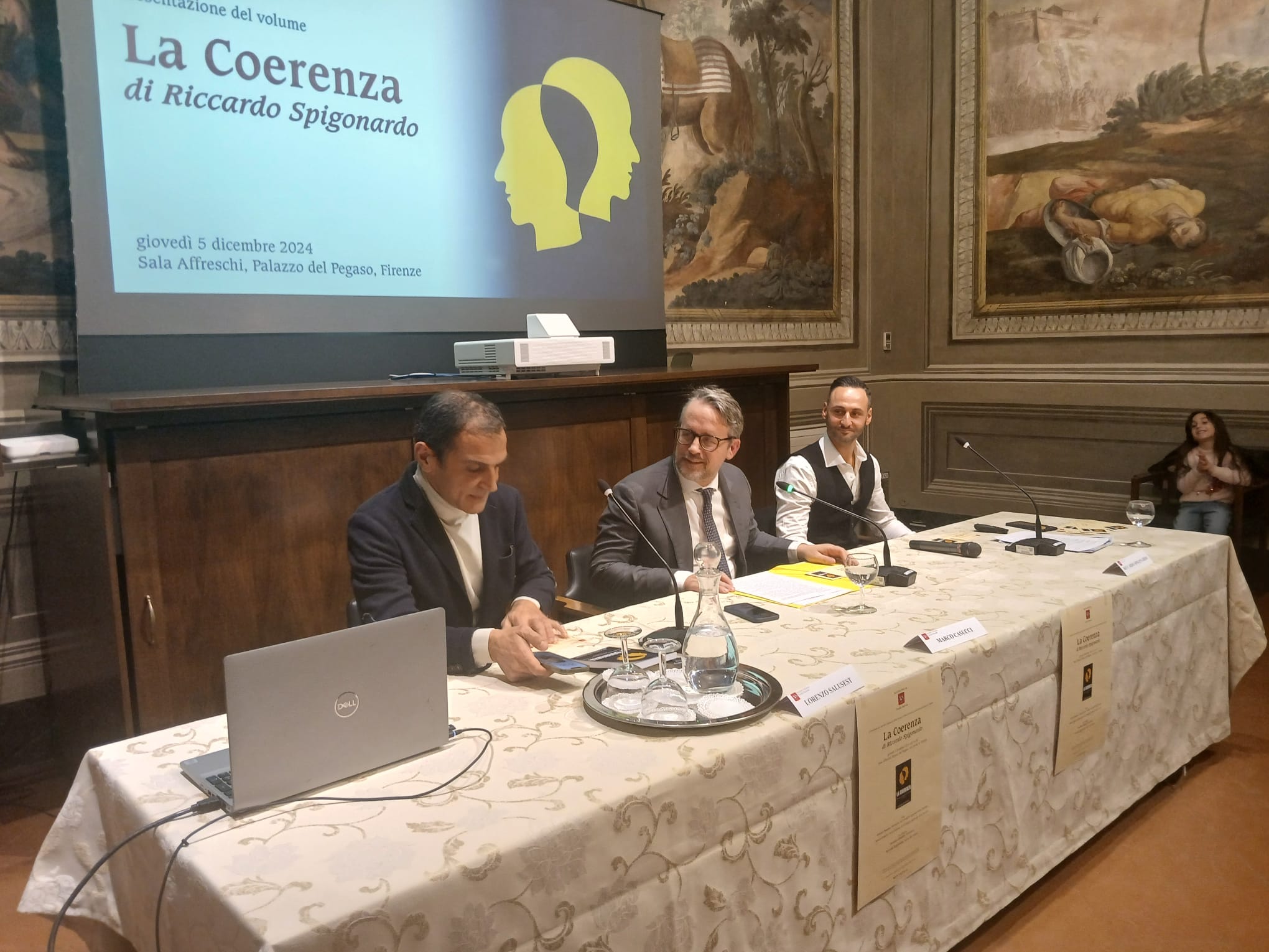 Firenze – Spesso le persone si trovano in situazioni in cui vengono criticate o subiscono tentativi di danneggiamento da parte di altre persone; questo anche a dispetto dell’impegno che le persone mettono in ciò che fanno. Sono situazioni che possono originare momenti bui e in quei momenti bui, quando le parole feriscono e le critiche ingiuste pesano, è essenziale mantenersi coerenti alle proprie idee e ai propri obiettivi. È questo il messaggio del libro “La coerenza. Mantenere l’Integrità tra le Critiche e l’Autostima”, scritto da Riccardo Spigonardo e presentato ieri pomeriggio nella sala degli Affreschi di palazzo del Pegaso. A fare gli onori di casa, il vicepresidente del Consiglio regionale, Marco Casucci. Ha moderato l’incontro il giornalista Lorenzo Salusest.