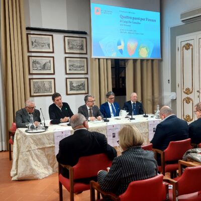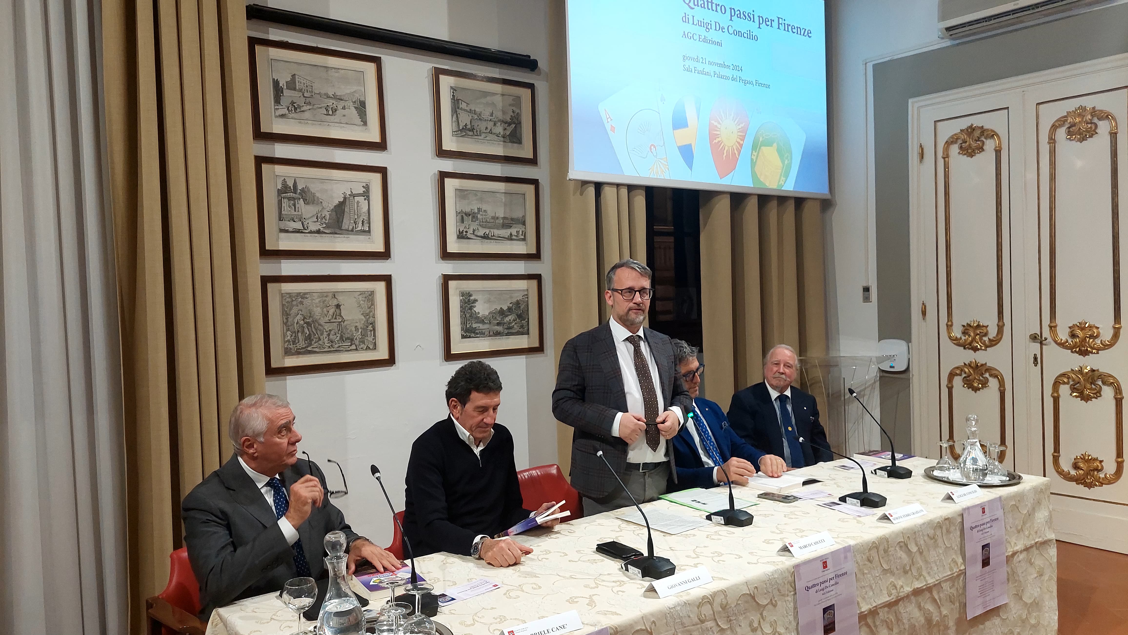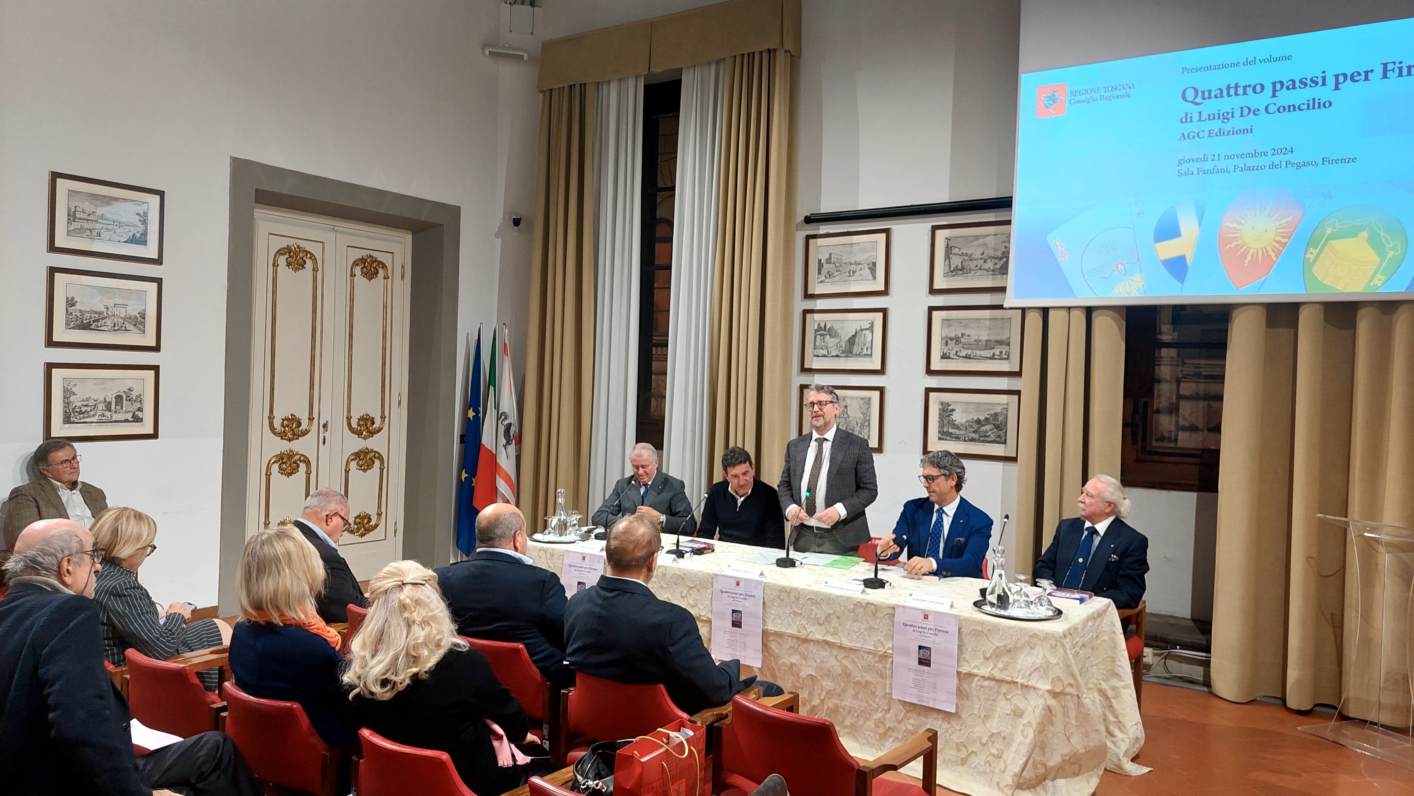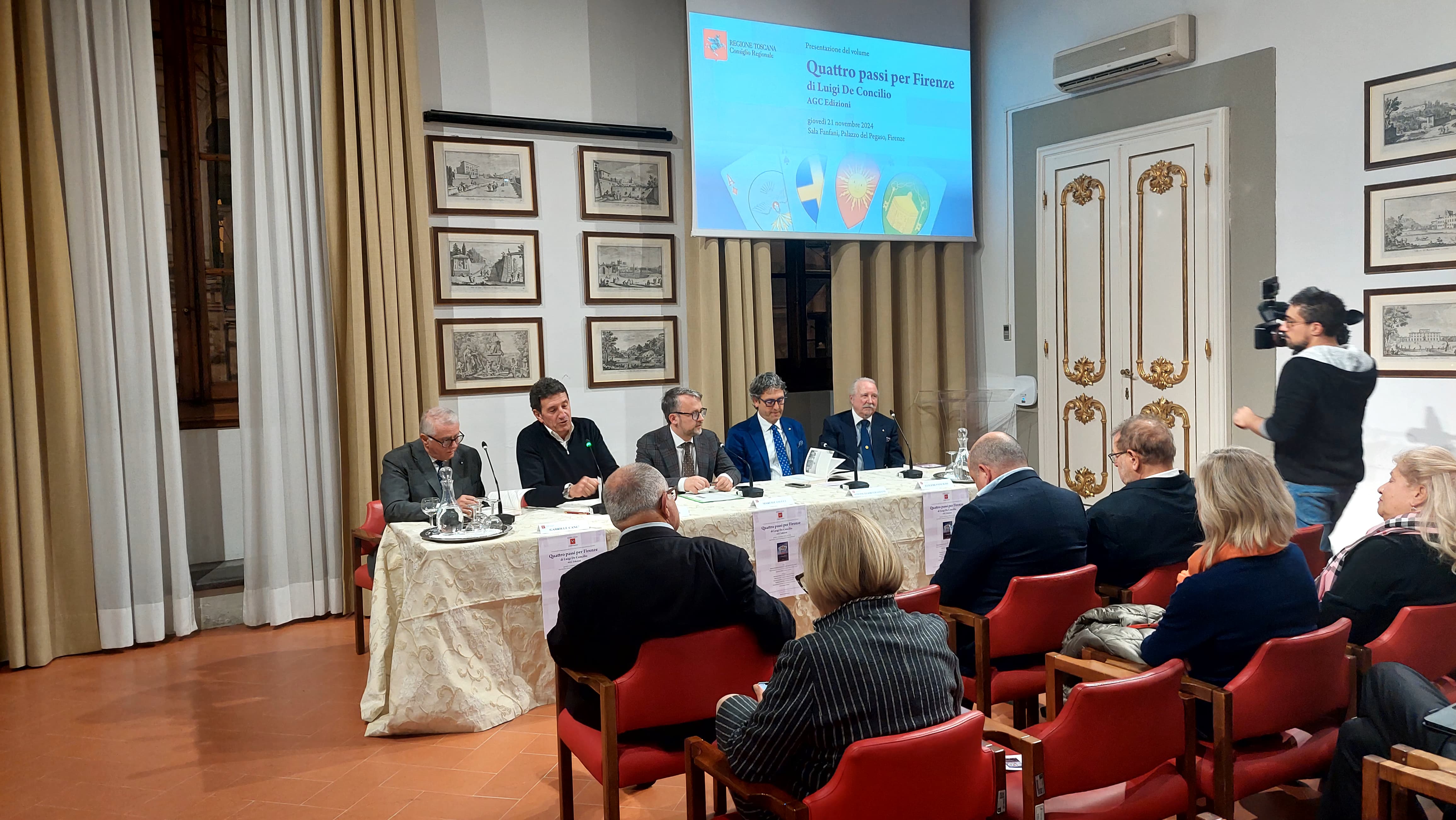 Firenze – “Come si chiamava in origine il Ponte Vecchio? Quanti sanno che il Negroni o il borotalco sono nati in via Tornabuoni? Quanti sanno che la contrapposizione tra Guelfi e Ghibellini nasce da un contratto di matrimonio non rispettato?” Luigi De Concilio, autore di ‘Quattro passi per Firenze’ (AGC edizioni) introduce la presentazione del suo libro, che si è svolta ieri pomeriggio nella sala Fanfani di palazzo del Pegaso. Un libro che rivela angoli e piazze segrete, aneddoti e curiosità di Firenze, spesso sconosciuti ai suoi stessi abitanti. È una Firenze diversa, introvabile nelle guide turistiche, ma capace di affascinare con storie divertenti e scorci inaspettati dietro a monumenti, palazzi o chiese famose, quella che racconta Luigi De Concilio. E si tratta di un nuovo e più ampio sguardo sulla città (ci si muove in ognuno dei quattro quartieri storici – San Giovanni, Santa Maria Novella, Santo Spirito e Santa Croce) e non più nel colo centro storico come era avvenuto nel 2019 con il volume ‘Firenze bizzarra’.