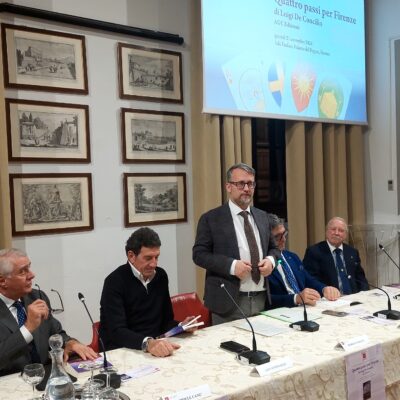 “A due anni dalla presentazione di ‘Curiosando in Casentino’ del fiorentinissimo Luigi De Concilio, che però si è trasferito in terra aretina, oggi presentiamo ‘Quattro passi per Firenze’ che è un libro che scava nella memoria e che consente di registrare sulla carte curiosità, aneddoti e dicerie che ancora si possono udire in città”, ha detto il vicepresidente del Consiglio regionale, Marco Casucci. “E’ un libro importante, perché la conservazione della memoria è un pilastro grazie al quale possiamo costruire un futuro degno della storia di questa meravigliosa città”. Casucci ha aggiunto di “essere particolarmente contento” della presenza di alcuni consiglieri comunali di Firenze.