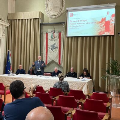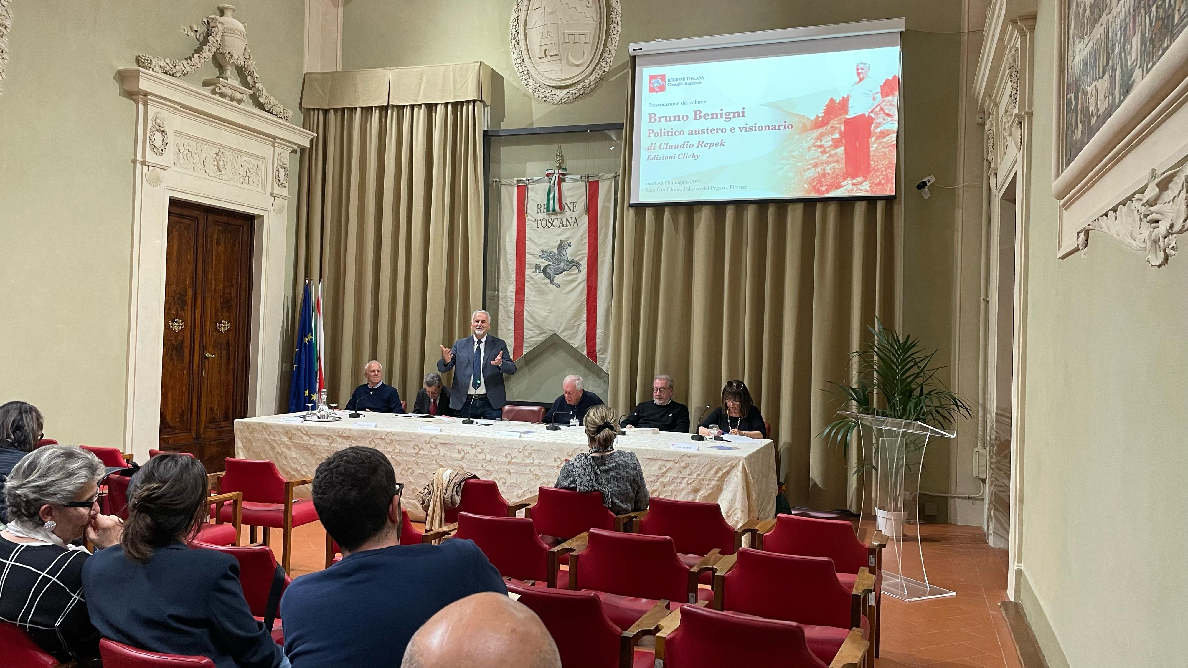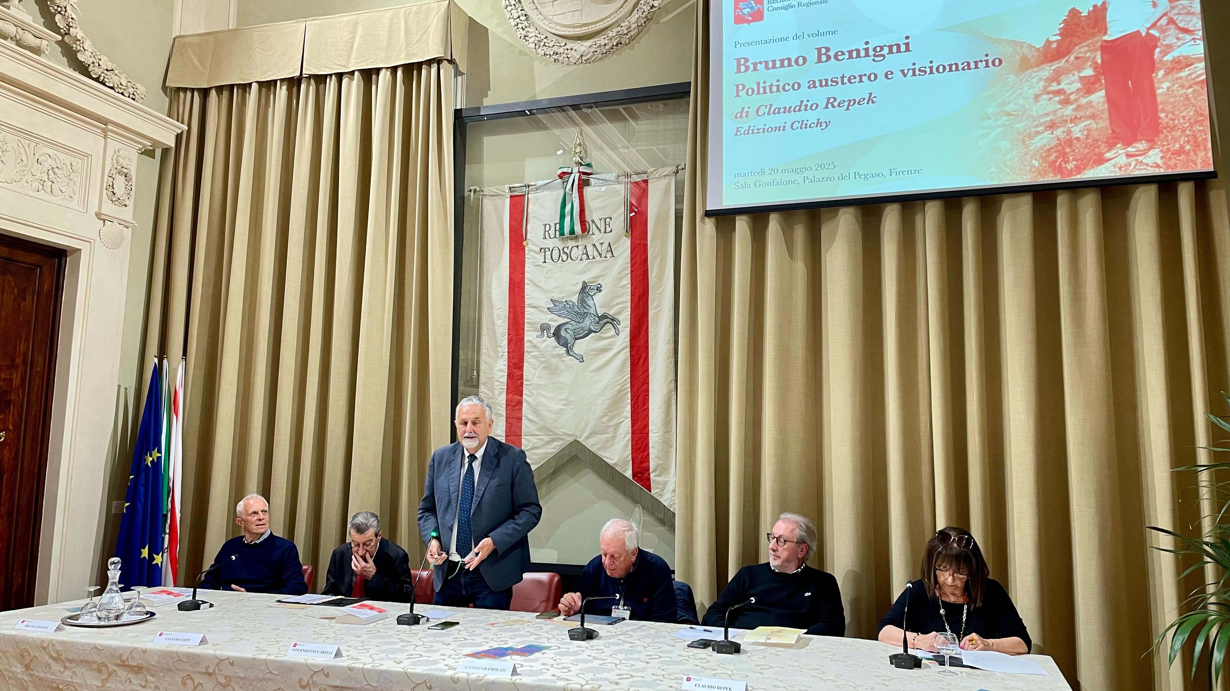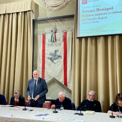 Firenze – La vita di ‘Bruno Benigni. Politico austero e visionario’ è stata raccontata da Claudio Repek nel libro, edito da Clichy, presentato martedì 20 maggio nella sala Gonfalone di palazzo del Pegaso. Benigni cattolico e poi comunista è stato protagonista del dialogo nel periodo che va dalla metà del Novecento ai primi anni del nuovo millennio. Uomo delle istituzioni: assessore prima della provincia di Arezzo e poi della Regione Toscana, sempre in prima linea nella difesa dei diritti degli ultimi. Regista della chiusura del manicomio di Arezzo, protagonista della fine degli ospedali psichiatrici giudiziari, accanito difensore del diritto alla salute dei detenuti. Originale la sua visione della sanità territoriale, con il progetto delle case della salute e poi la proposta di legge della ‘residenzialità sociale senza emarginazione’ che avrebbe evitato le attuali rsa di grandi dimensioni.