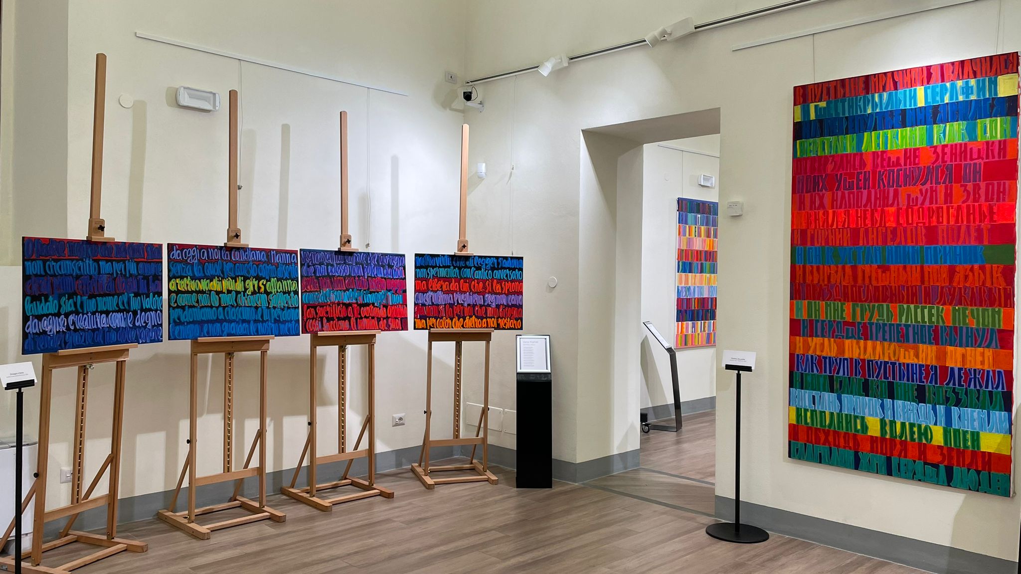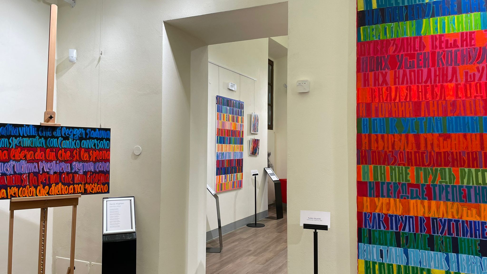 La curatrice, Silvia Pampaloni, spiega che le opere in mostra propongono “una realazione che sta molto a cuore all’artista, la relazione tra arte, poesia e colore. In quest’occasione, per il luogo in cui sarebbe stata ospitata questa mostra, Mira ha realizzato un polittico dedicato a Dante Alighieri