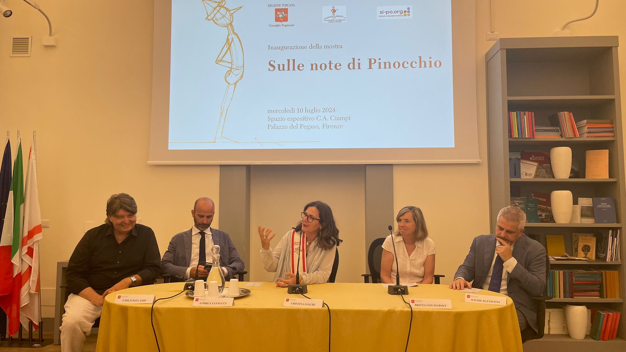 Firenze – Nello spazio espositivo C.A. Ciampi a palazzo del Pegaso in via de’ Pucci 16, è stata inaugurata la mostra “Sulle note di Pinocchio”. Sono intervenuti Cristina Giachi presidente della commissione Cultura del Consiglio regionale; Andrea Vannucci, consigliere regionale; Davide Battistini, segretario generale Fondazione Carlo Collod; Britta Von Websky, presidente Istituto culturale tedesco di Prato; Emiliano Landi, curatore della mostra.