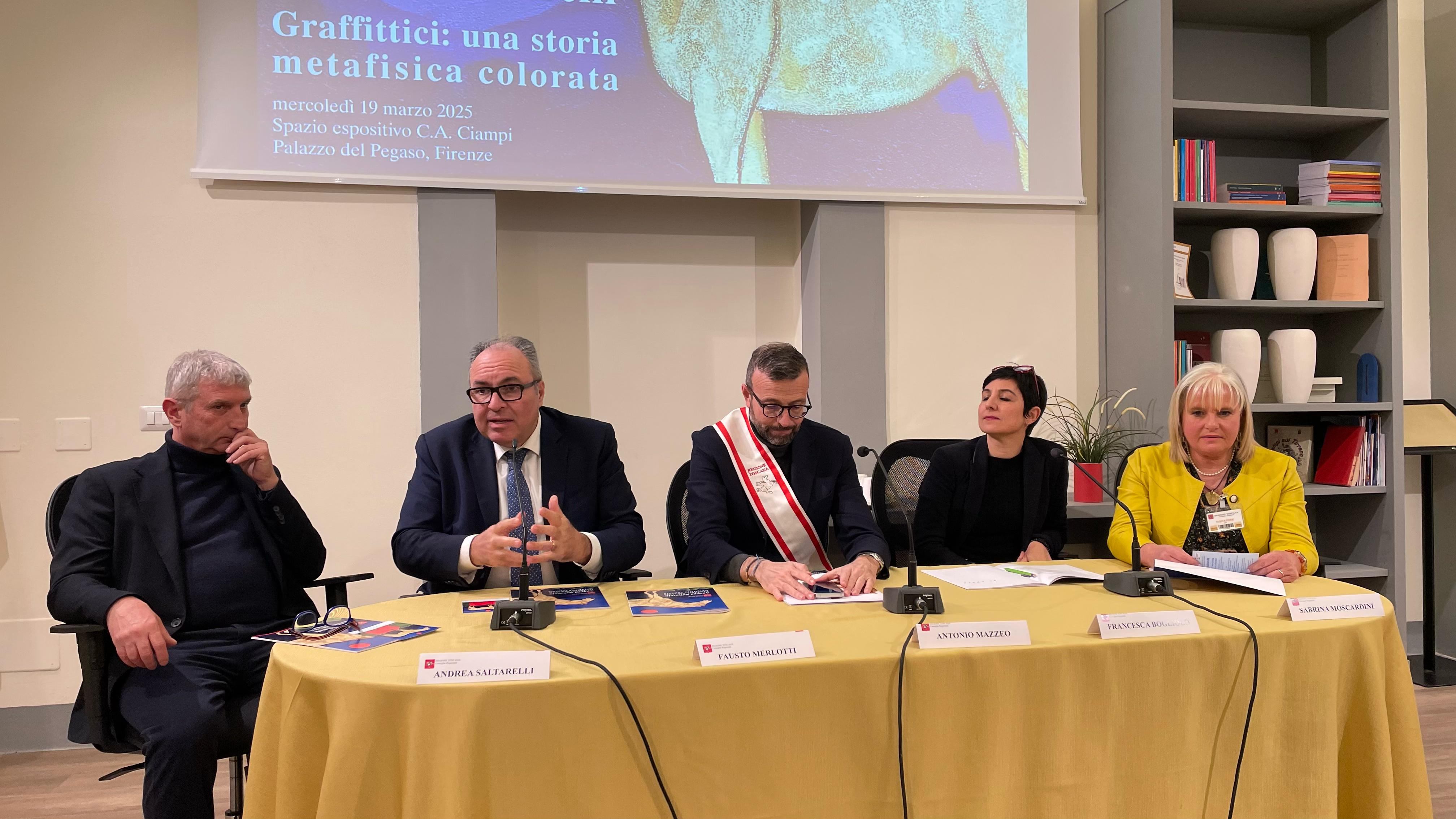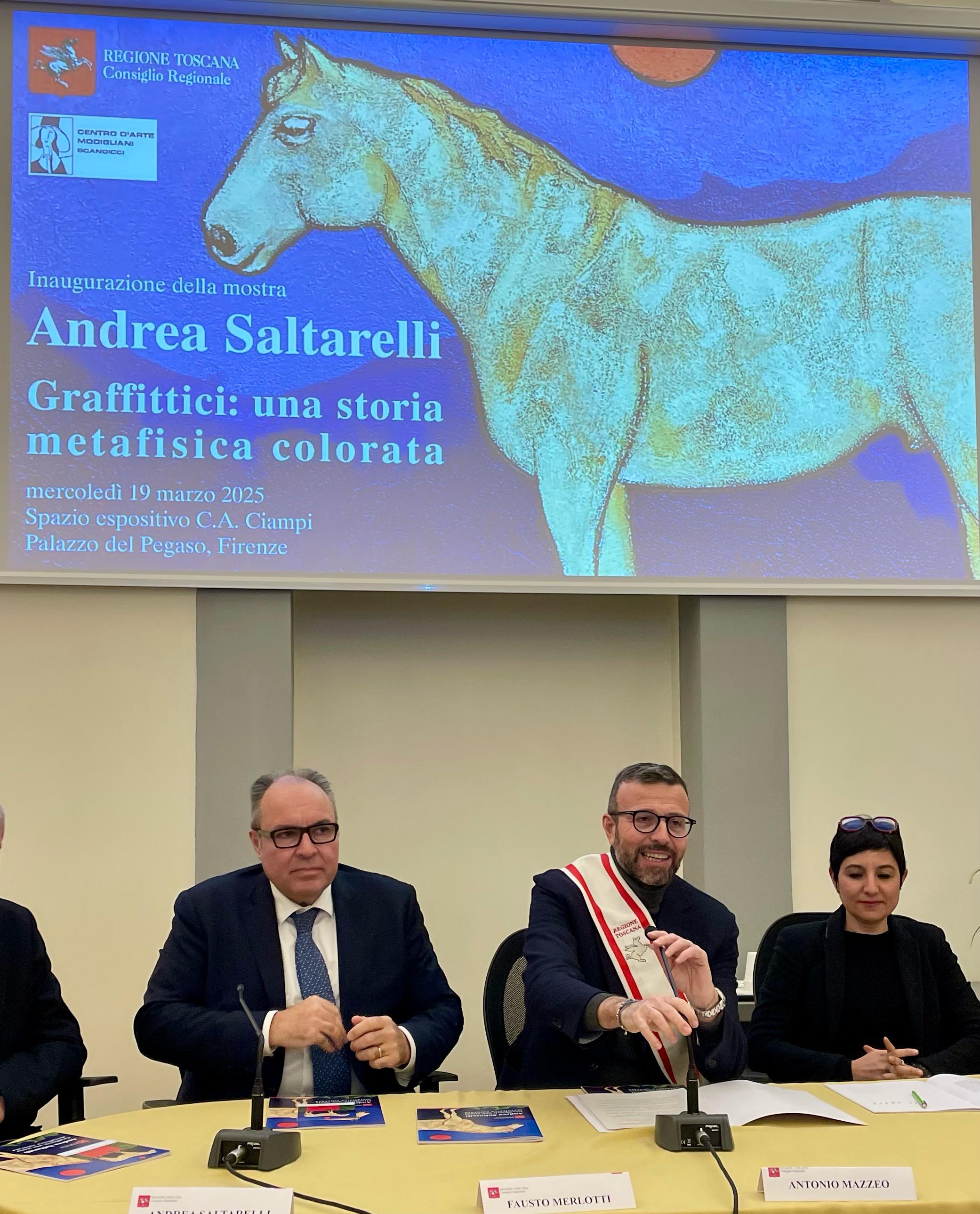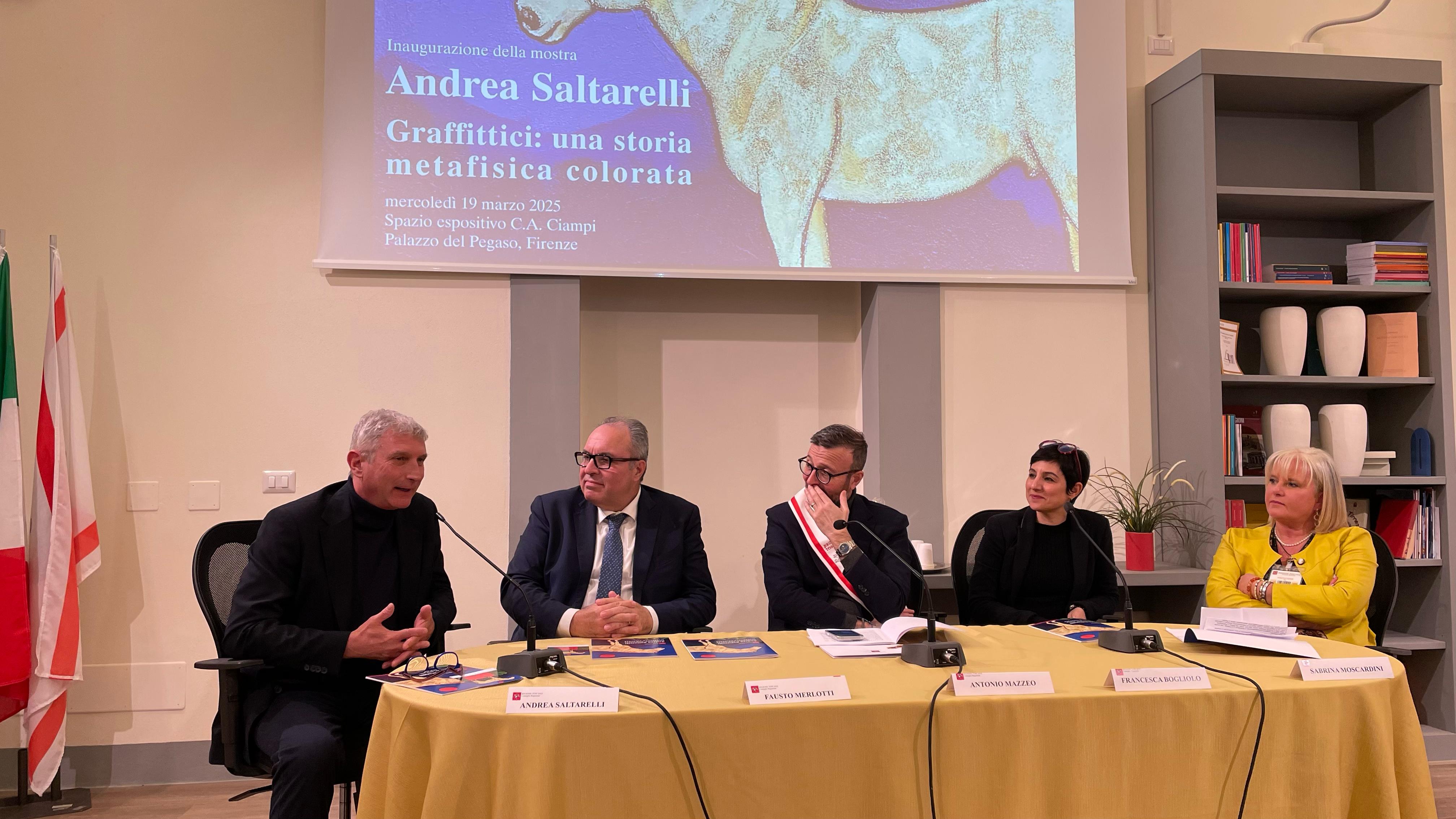 Firenze – Nello spazio espositivo Ciampi a palazzo del Pegaso è stata inaugurata la mostra di Andrea Saltarelli Graffittici: una storia metafisica colorata. Sono intervenuti Antonio Mazzeo, presidente dell’Assemblea legislativa; Fausto Merlotti, consigliere regionale: Francesca Bogliolo, critica d’arte; Sabrina Moscardini, presidente Centro d’arte Modigliani e l’artista Andrea Sartarelli.
