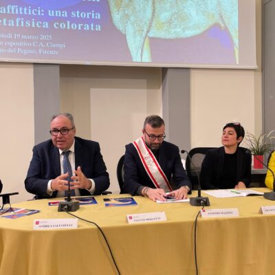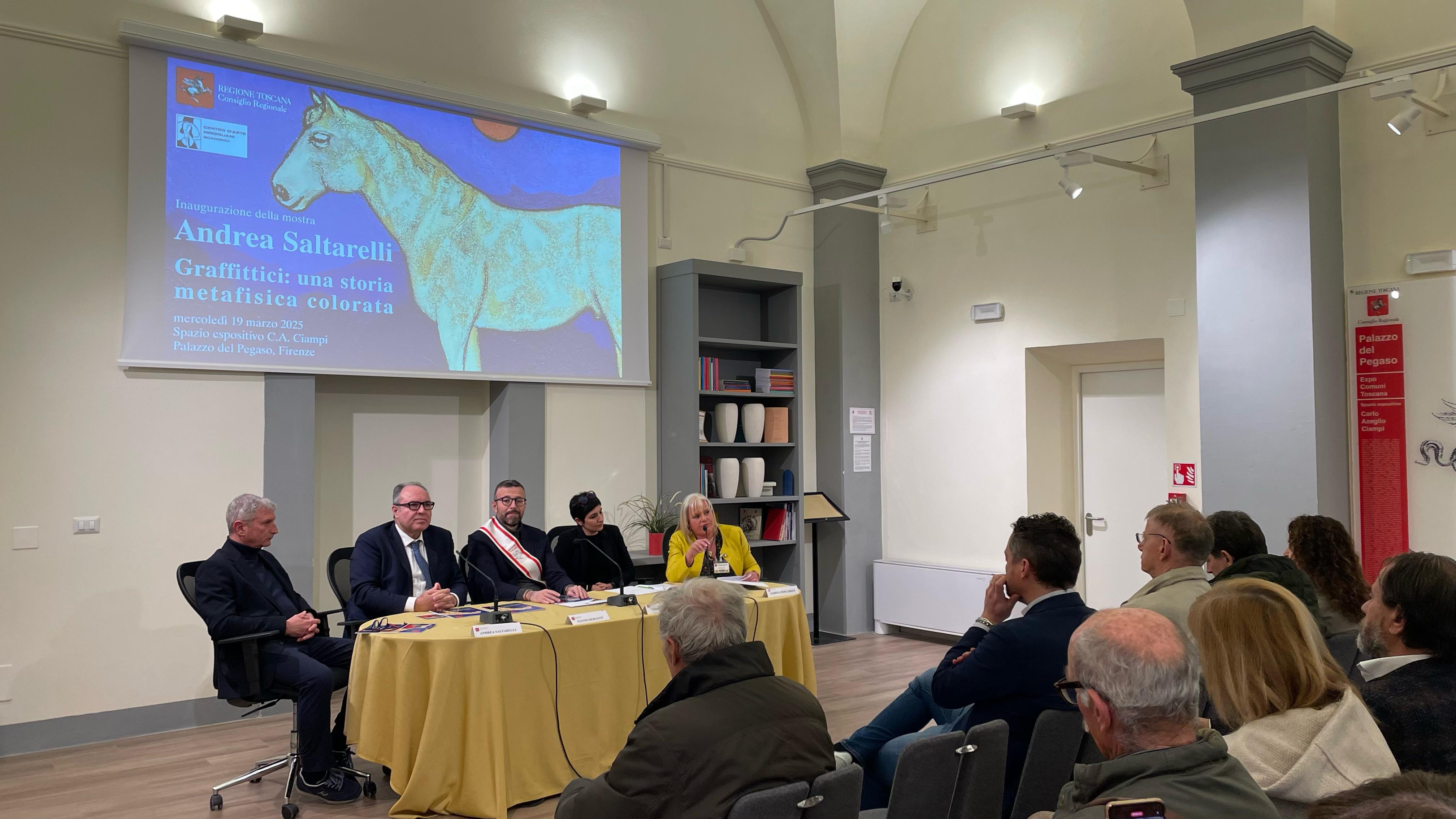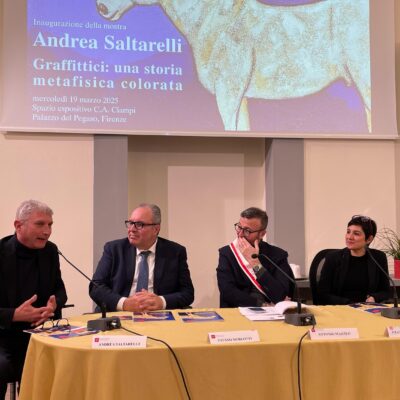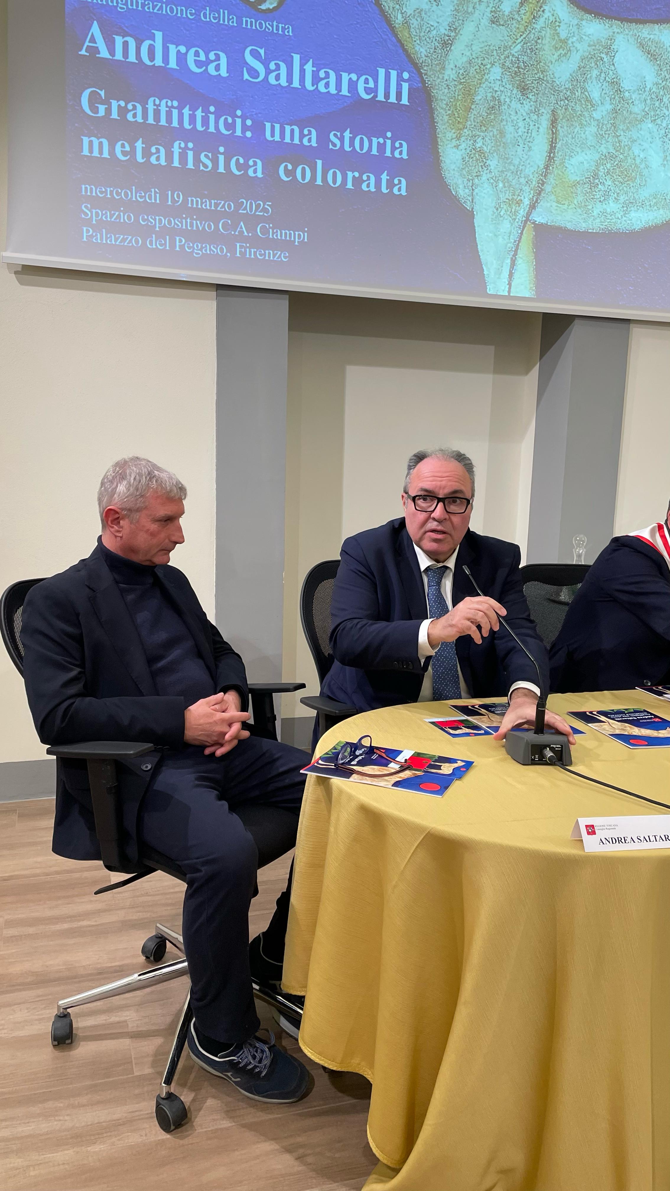 Firenze – Nello spazio espositivo Ciampi a palazzo del Pegaso è stata inaugurata la mostra di Andrea Saltarelli Graffittici: una storia metafisica colorata. Sono intervenuti Antonio Mazzeo, presidente dell’Assemblea legislativa; Fausto Merlotti, consigliere regionale: Francesca Bogliolo, critica d’arte; Sabrina Moscardini, presidente Centro d’arte Modigliani e l’artista Andrea Sartarelli.