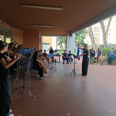 Durante l’inaugurazione alcuni studenti dell’orchestra della scuola si sono esibiti nell’ ‘Inno alla gioia’ di L.v. Beethoven e in ‘Galop infernal’ (can can) di J. Offenbach.