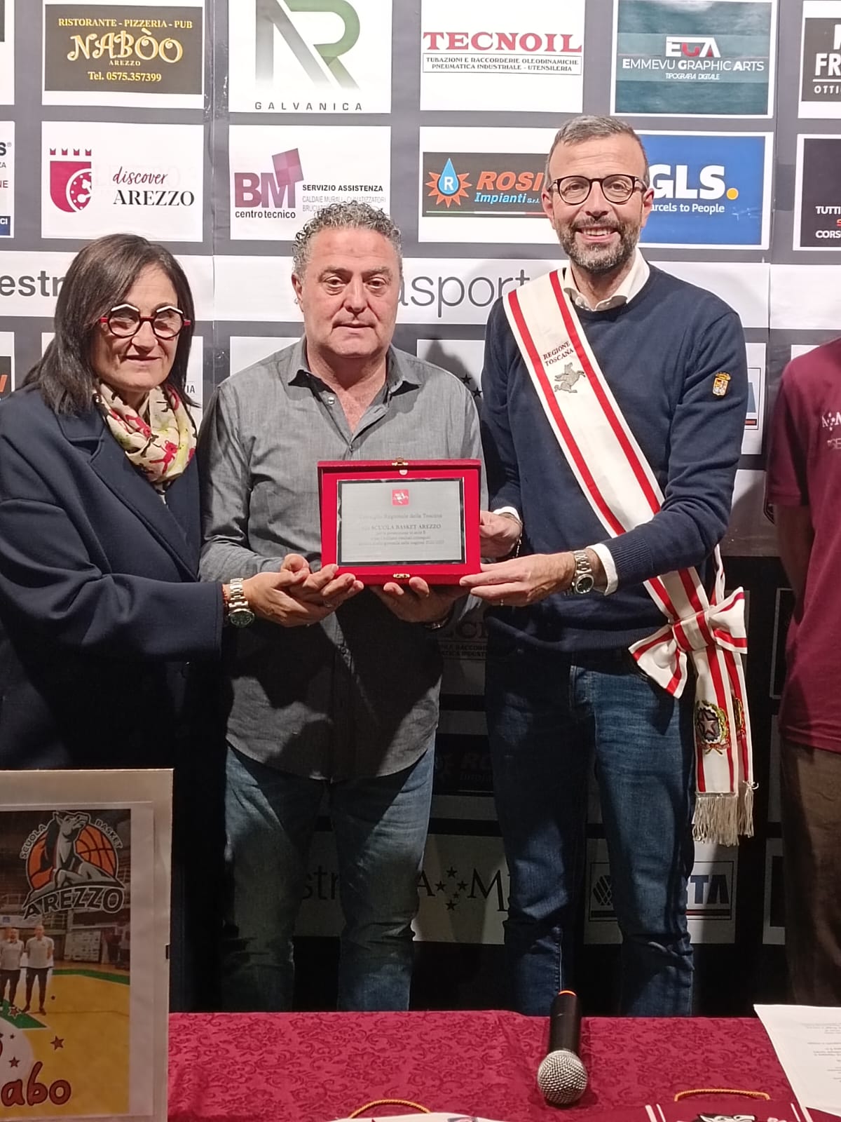 Firenze – Un riconoscimento da parte del Consiglio regionale alla Scuola Basket Arezzo per la promozione in serie B e per i brillanti risultati conseguiti anche a livello giovanile nella stagione 2022-2023. A consegnare la targa al presidente della SBA Mauro Castelli è stato il presidente dell’assemblea legislativa Antonio Mazzeo, affiancato dalla consigliera regionale Lucia De Robertis, nel corso di una cerimonia che si è tenuta ieri sera (lunedì 23 ottobre) al palasport Estra “Mario d’Agata” alla presenza di dirigenti, tecnici e di tanti giovani giocatori della Sba.