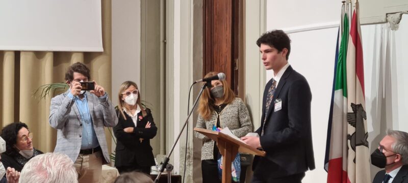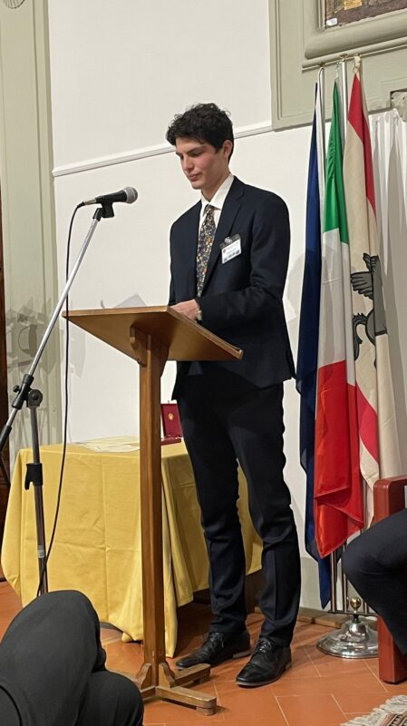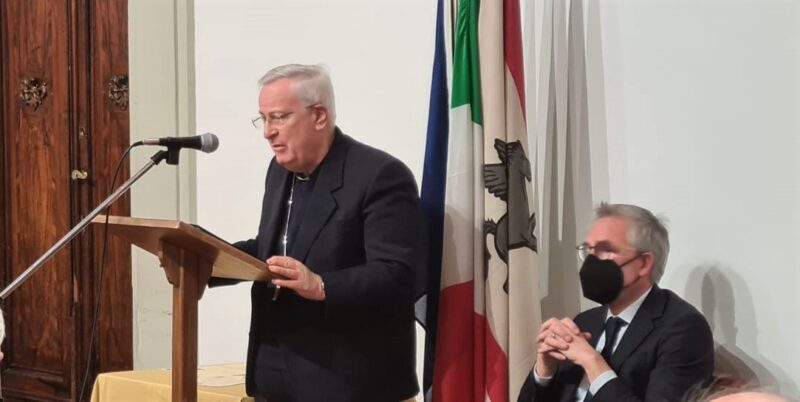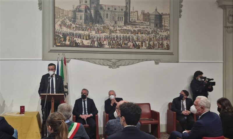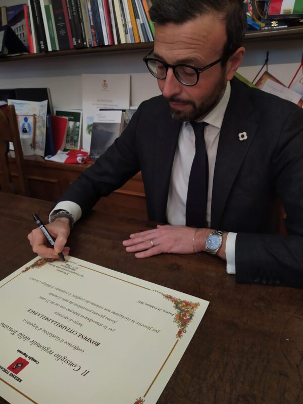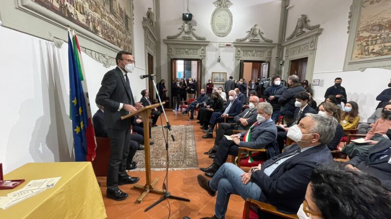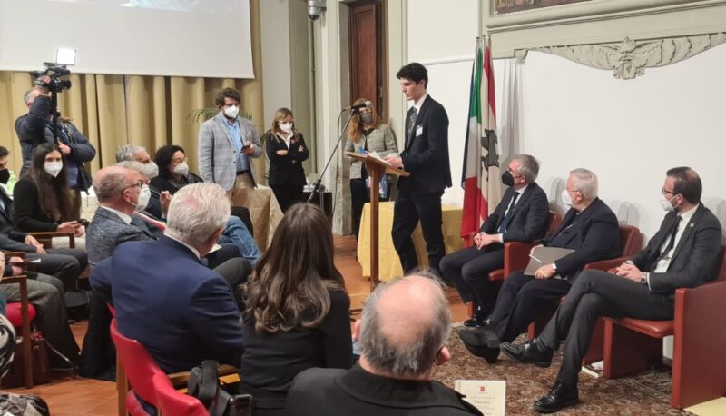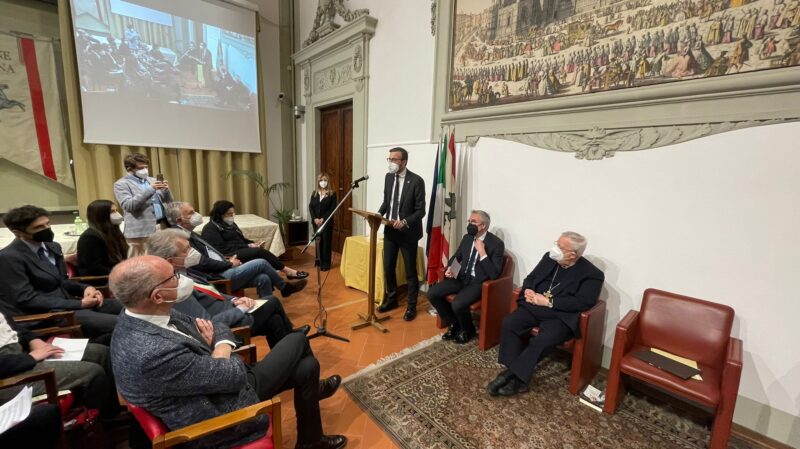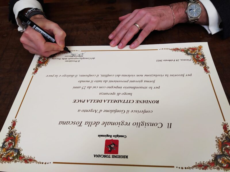 Il Gonfalone d’argento del Consiglio regionale della Toscana è stato consegnato a Rondine Cittadella della Pace, “luogo di speranza, per lo straordinario impegno con cui da oltre 25 anni forma giovani provenienti da tutto il mondo per favorire la risoluzione non violenta dei conflitti, il confronto, il dialogo e la pace”. Il massimo riconoscimento dell’Assemblea regionale è stato consegnato oggi, lunedì 28 febbraio, dal presidente Antonio Mazzeo a Franco Vaccari, alla presenza del cardinale Gualtiero Bassetti, presidente della Conferenza episcopale italiana. Come annunciato dieci giorni fa, in occasione della visita di una delegazione del Consiglio regionale, Mazzeo ha dato seguito all’impegno di assegnare il riconoscimento. Tante le autorità presenti oltre a Mazzeo: i vicepresidenti del Consiglio regionale Stefano Scaramelli e Marco Casucci, i consiglieri regionali Vincenzo Ceccarelli, Lucia De Robertis, Giovanni Galli, Fausto Merlotti, Massimiliano Pescini, Cristiano Benucci e Marco Stella, il presidente della Toscana Eugenio Giani, il sindaco di Arezzo Alessandro Ghinelli, il senatore Riccardo Nencini, anch’egli già presidente del Consiglio regionale, l’assessora all’Educazione e welfare del Comune di Firenze Sara Funaro e monsignor Vasco Giuliani.